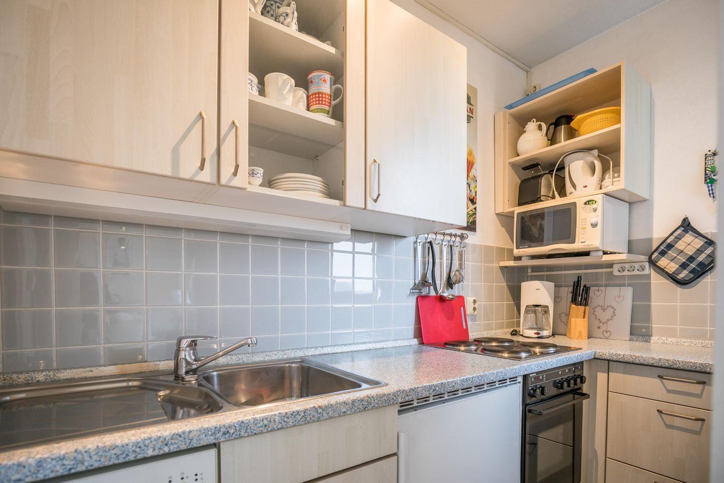 Herd mit 4 Kochplatten, Backofen, Geschirrspüler, Mikrowelle, Eierkocher, Wasserkocher, Kaffeemaschine