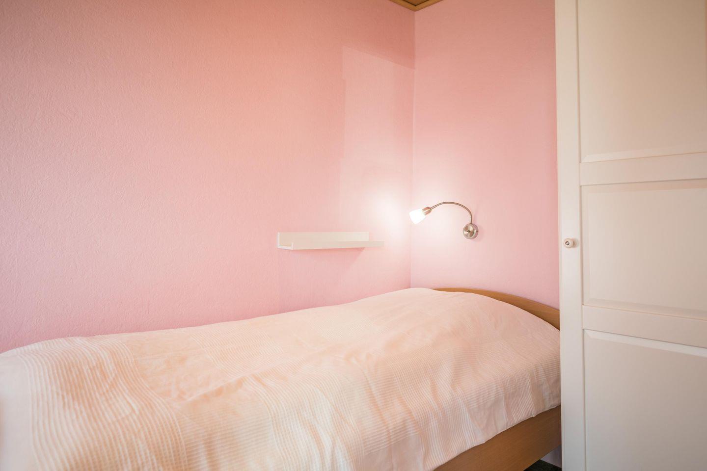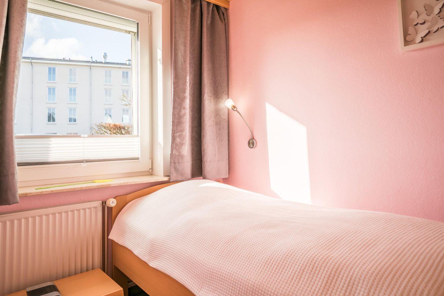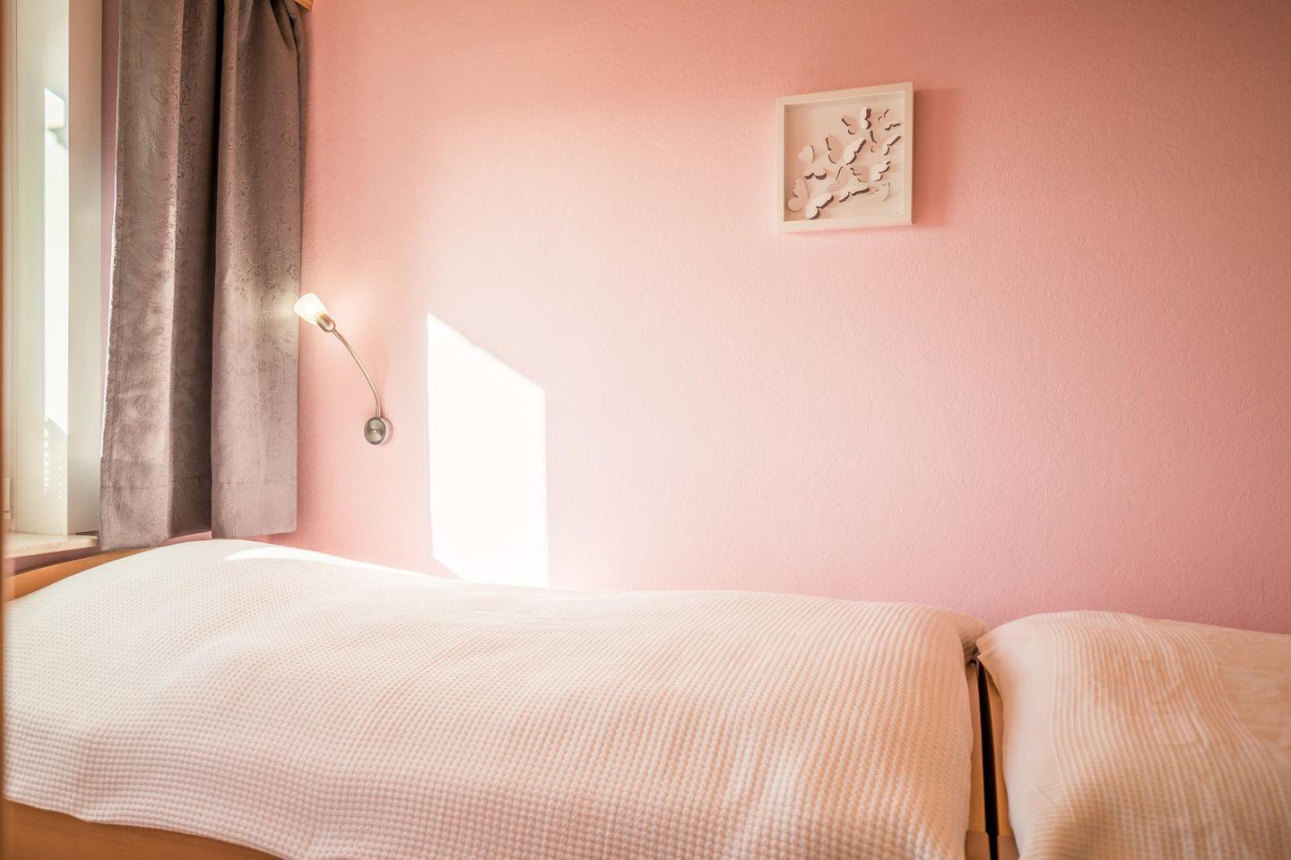 2 Einzelbetten, kleiner Kleiderschrank, Nachttische + Lampen, Aussenrollo, Plissee