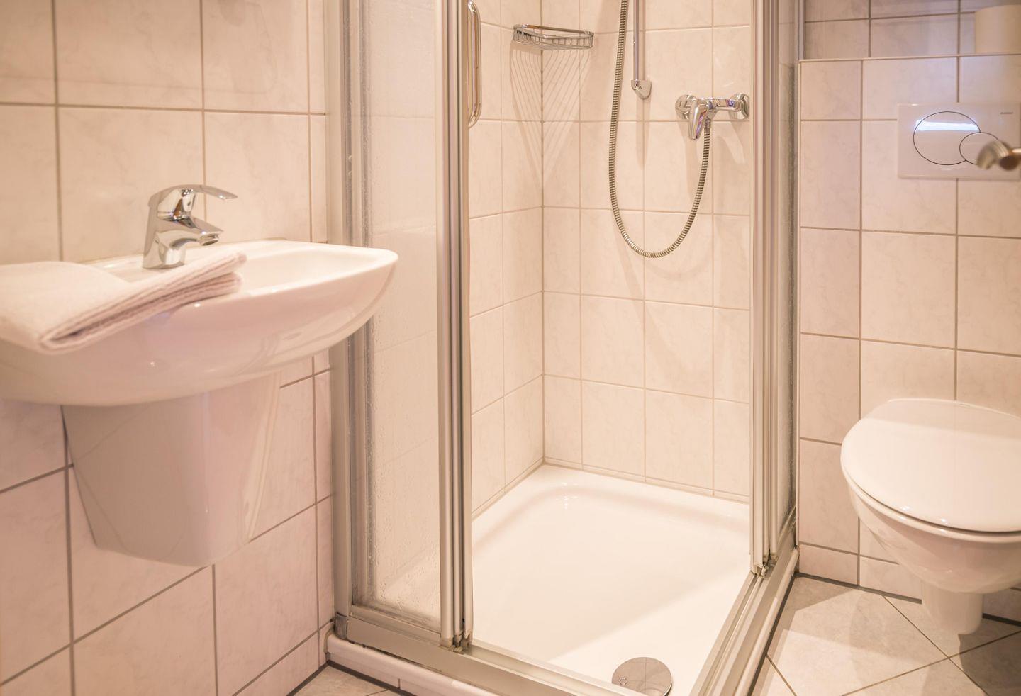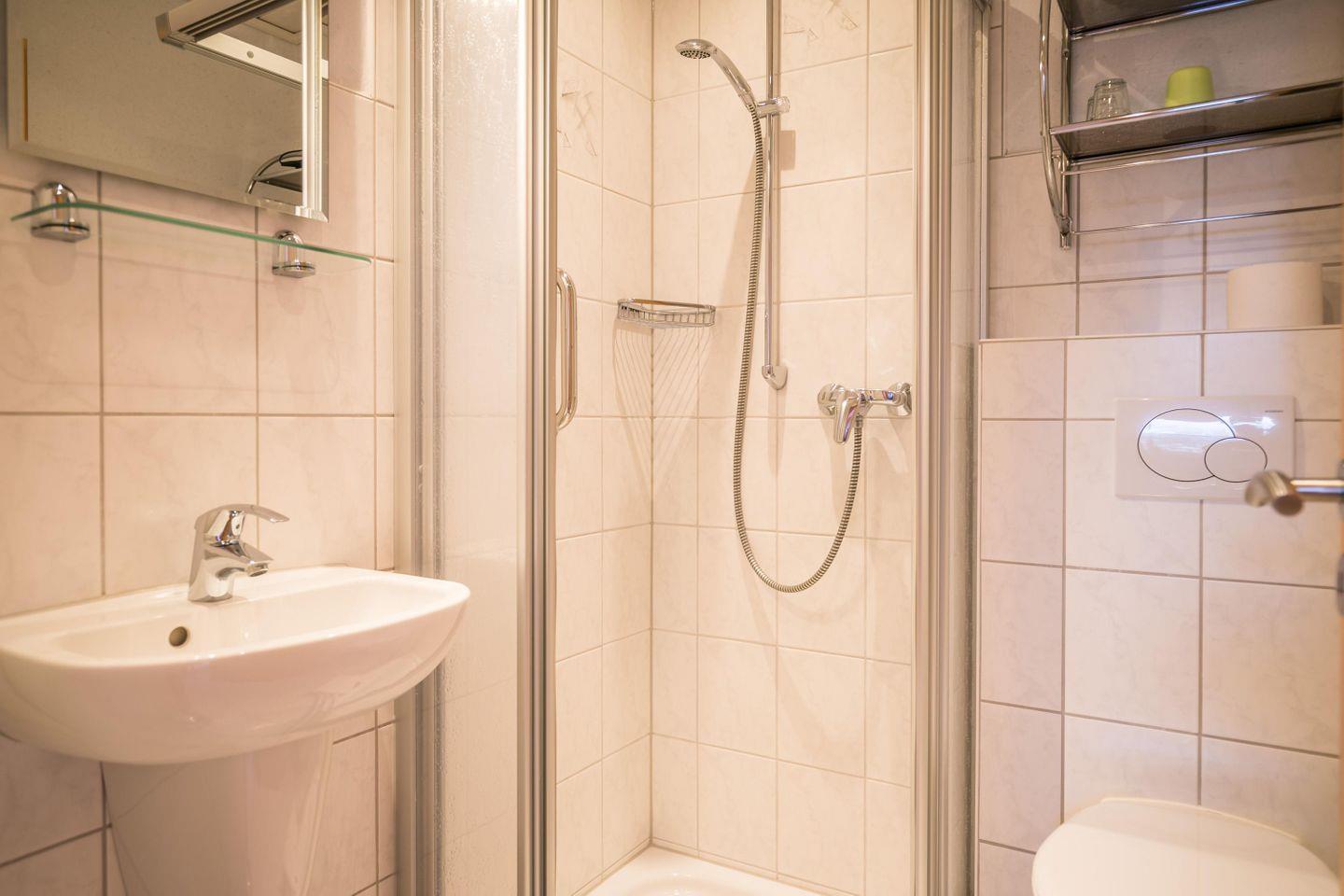 Dusche, WC, Waschbecken, Spiegel, Handtuchtrockner, Abluft, Föhn_2 Einzelbetten, kleiner Kleiderschrank, Nachttische + Lampen, Aussenrollo, Plissee