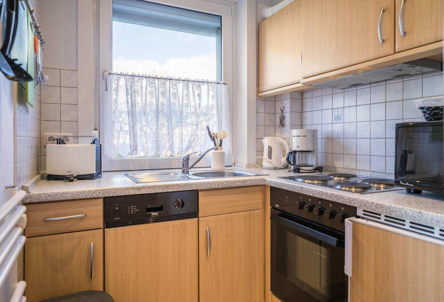 4-Plattenherd, Backofen, Mikrowelle, Geschirrspüler, Kühlschrank mit Gefrierfach, Wasserkocher, Kaffeemaschine, Toaster, Fenster mit Aussenrollo