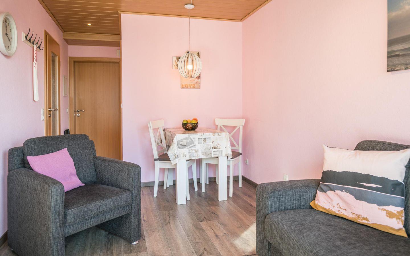 2er Polstersofa, Sessel, Beistelltisch, Flachbild-TV, DVD- und BluRay-Player, Tisch und 2 Stühle, Kommode, Deckenfluter, Zugang zum Balkon, Aussenrollo und Plissee, Garderobe