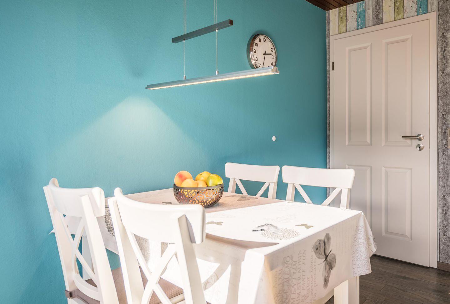 Couch, Flachbild-TV, DVD&Blu-ray-Player, Esstisch mit 4 Stühlen, Kommode, Zugang zum Balkon