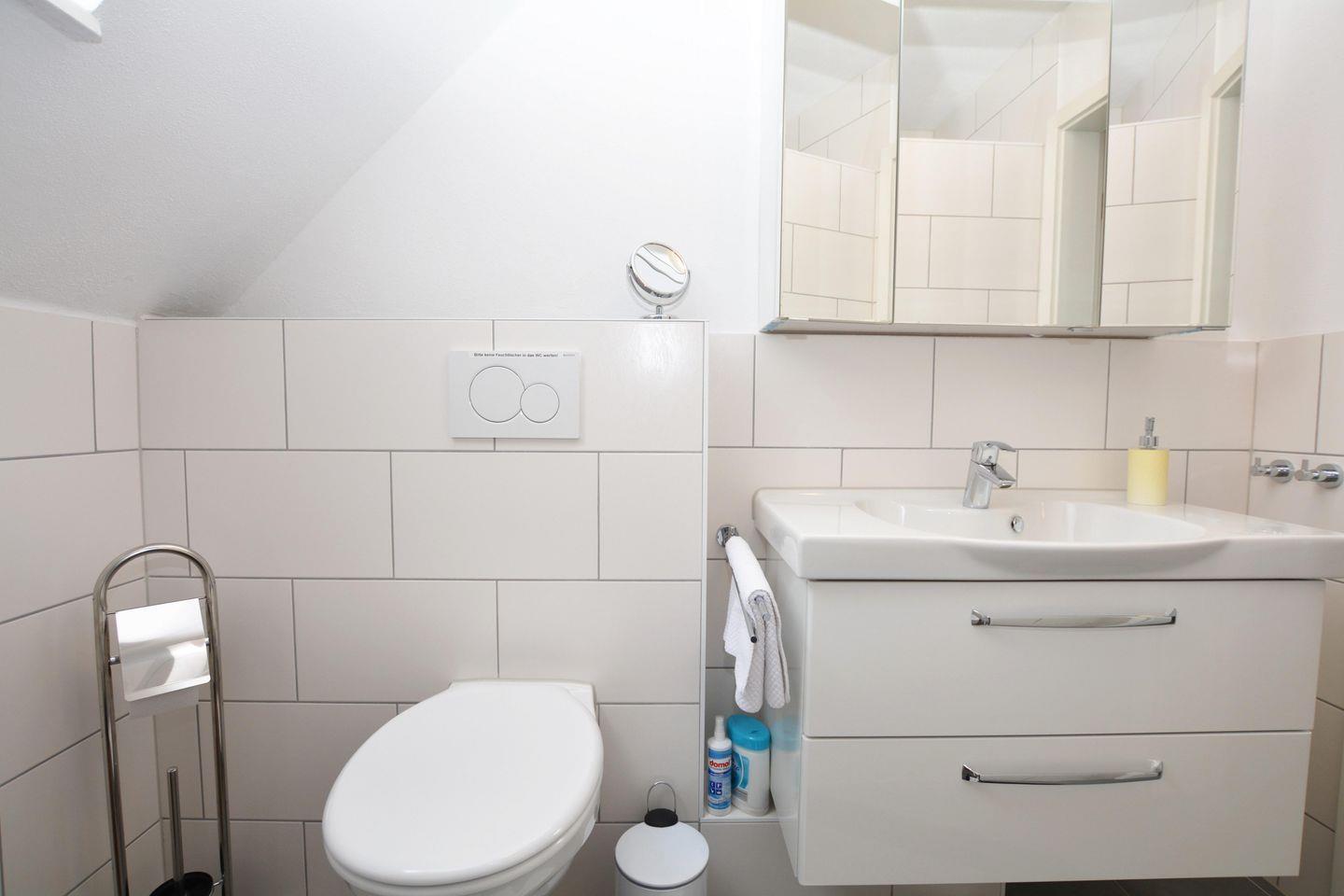 Dusche, WC, Spiegelschrank, Fenster, Kosmetikspiegel, Duschhocker, Föhn