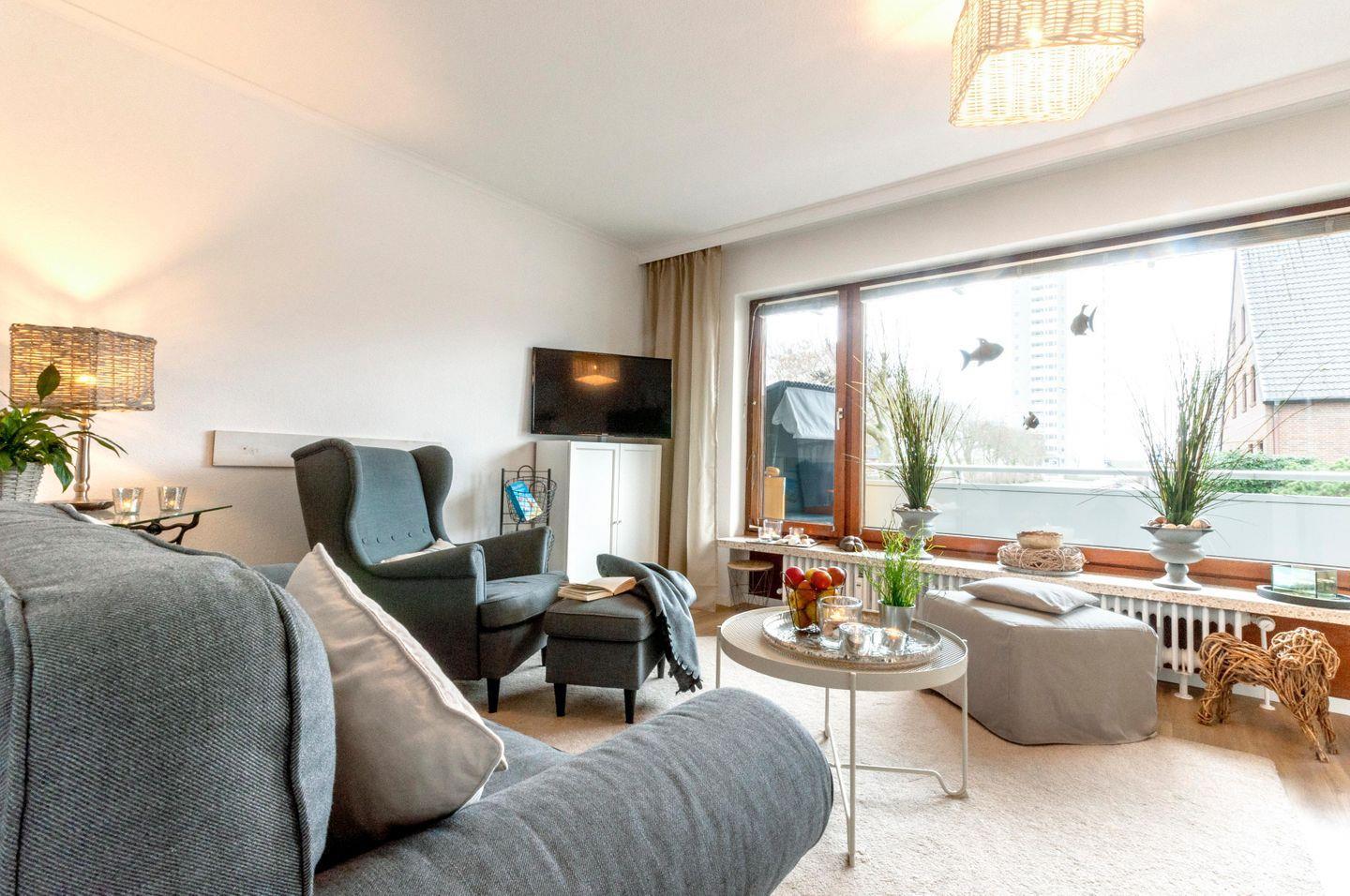 Die Hochparterre Wohnung 2 im Haus Luv wurde vor kurzem renoviert und hat einen schönen Sonnen-Balkon. Im eigenen Strandkorb können Sie das Treiben rund um die Perlebucht und dem Hochhaus entspannt verfolgen.