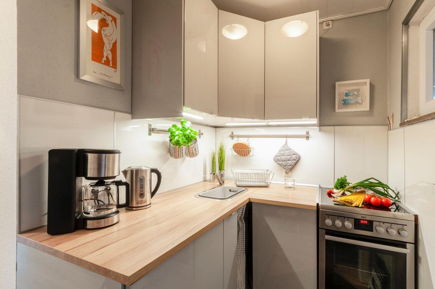 Ceranfeld, Backofen, Kühlschrank m. Gefrierfach, Geschirrspüler, Wasserkocher, Toaster, Eierkocher, Kaffeemaschine, Fenster