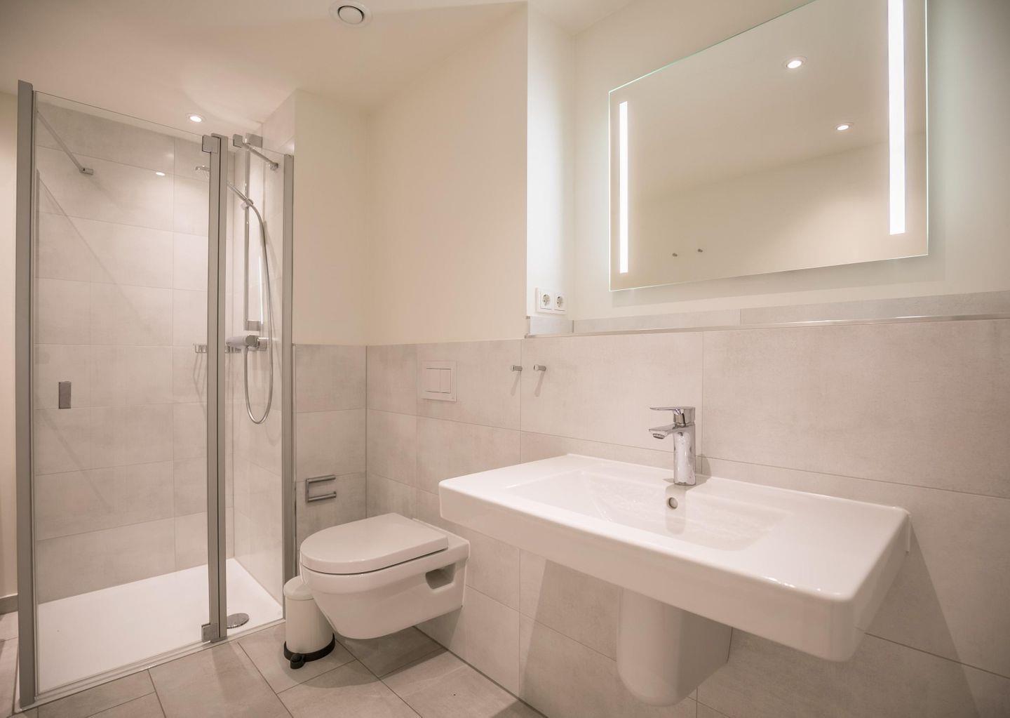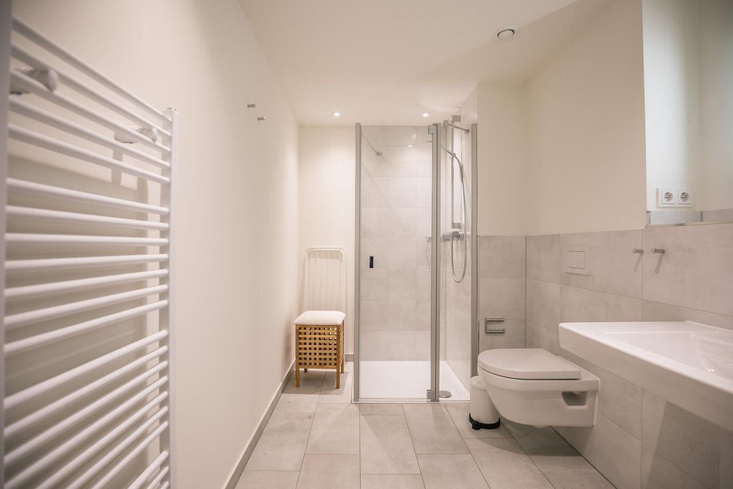 Dusche bodengleich, WC, Waschbecken, beleuchteter Spiegel, Handtuchtrockner, Lüfter, kleines Regal, Ablage am Spiegel