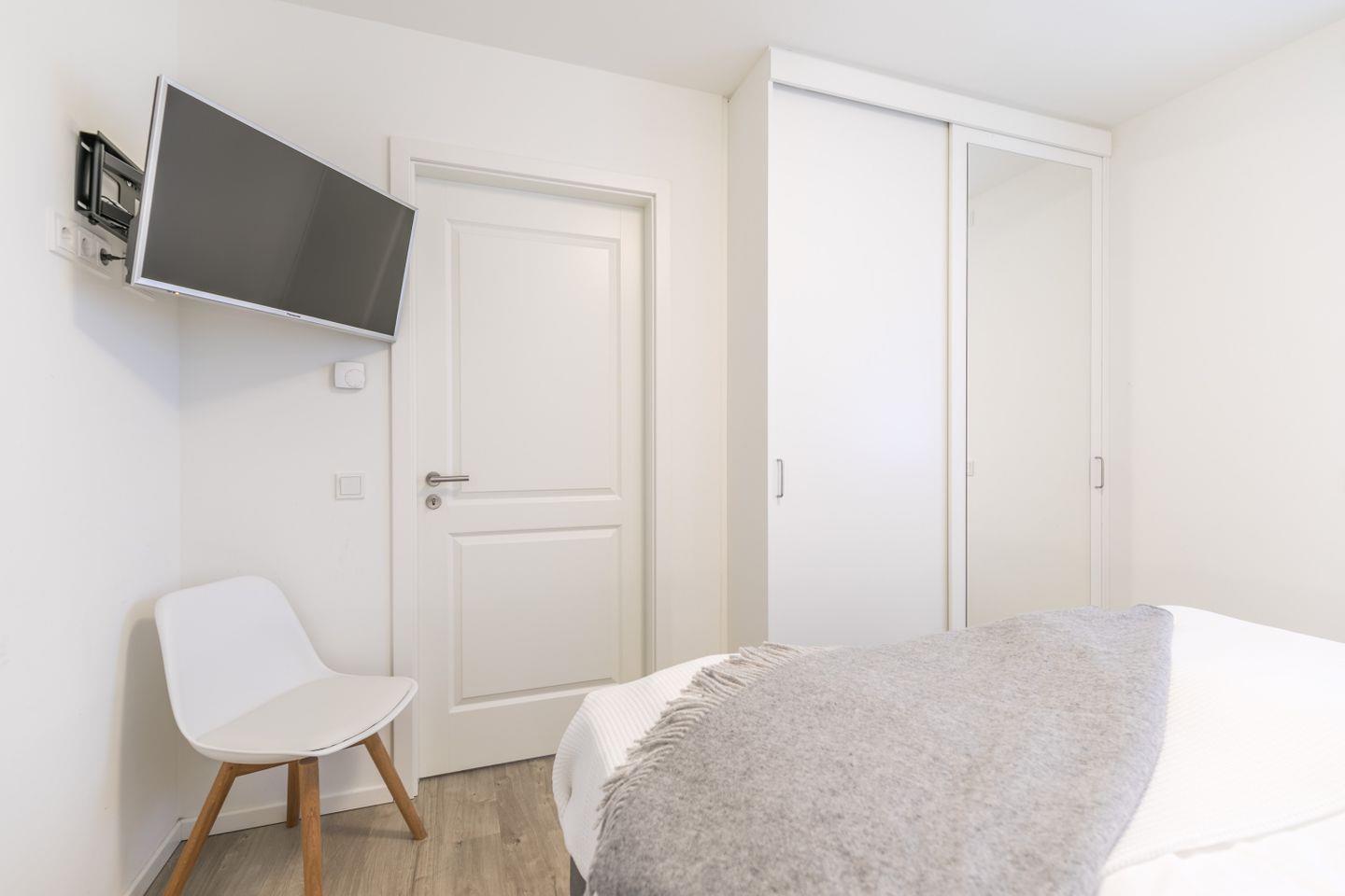 Boxspringdoppelbett mit durchgehendem Topper (180 cm 200cm), Nachttische + Lampen, Kleiderschrank 2-türig mit Ganzkörperspiegel, Flachbild-TV, 4-Jahreszeiten-Bettdecken, Außenjalousien, Stuhl