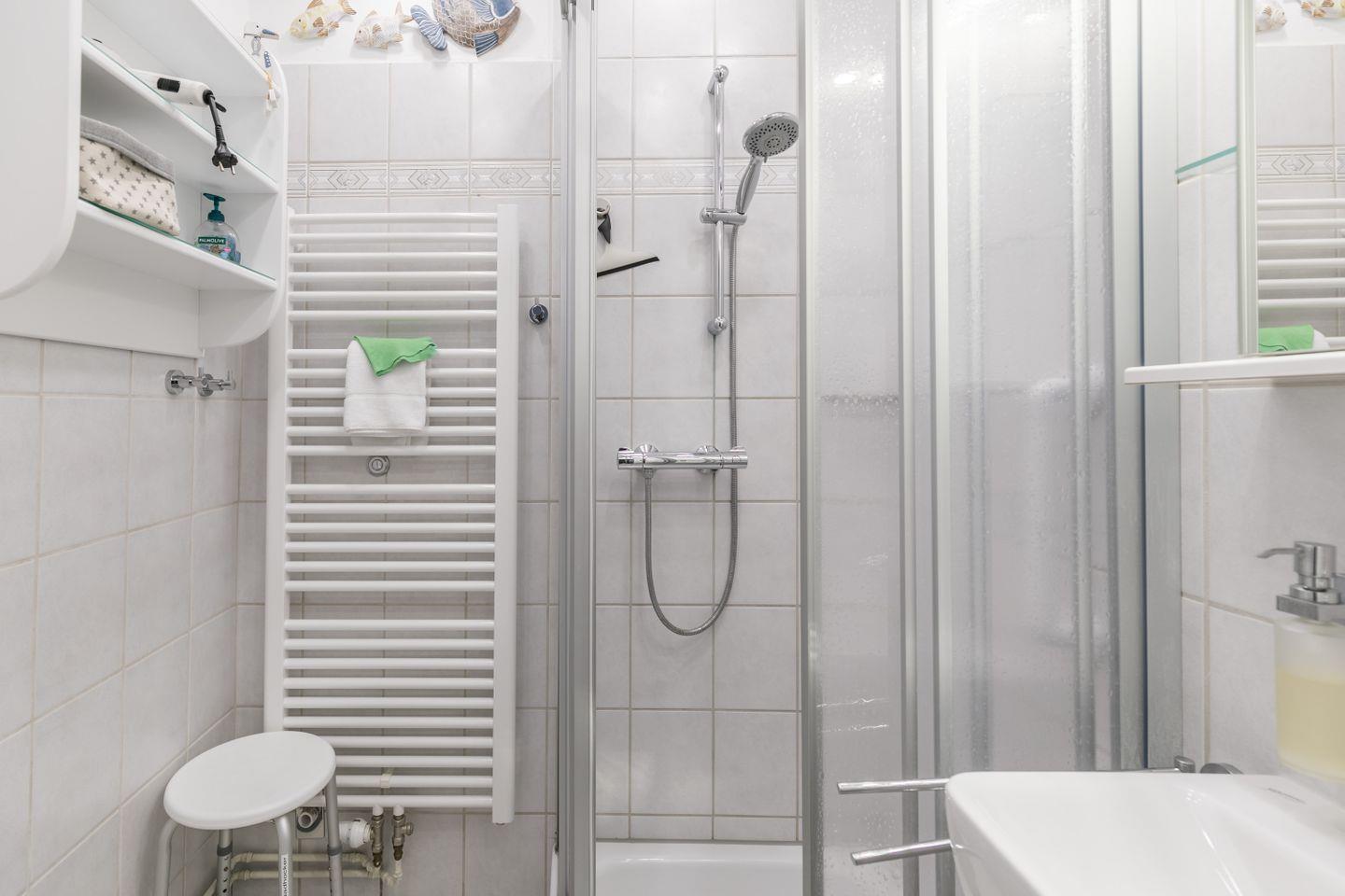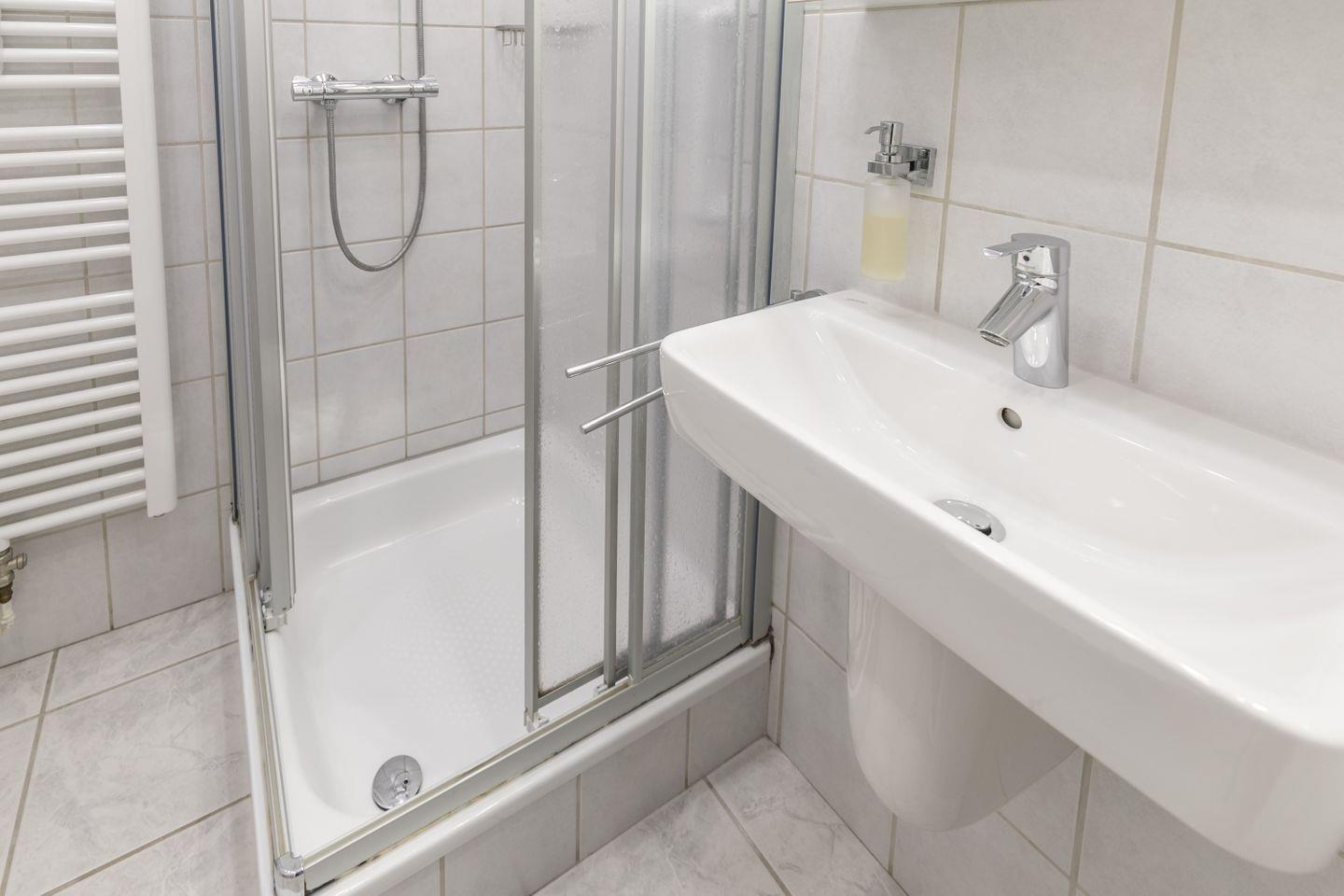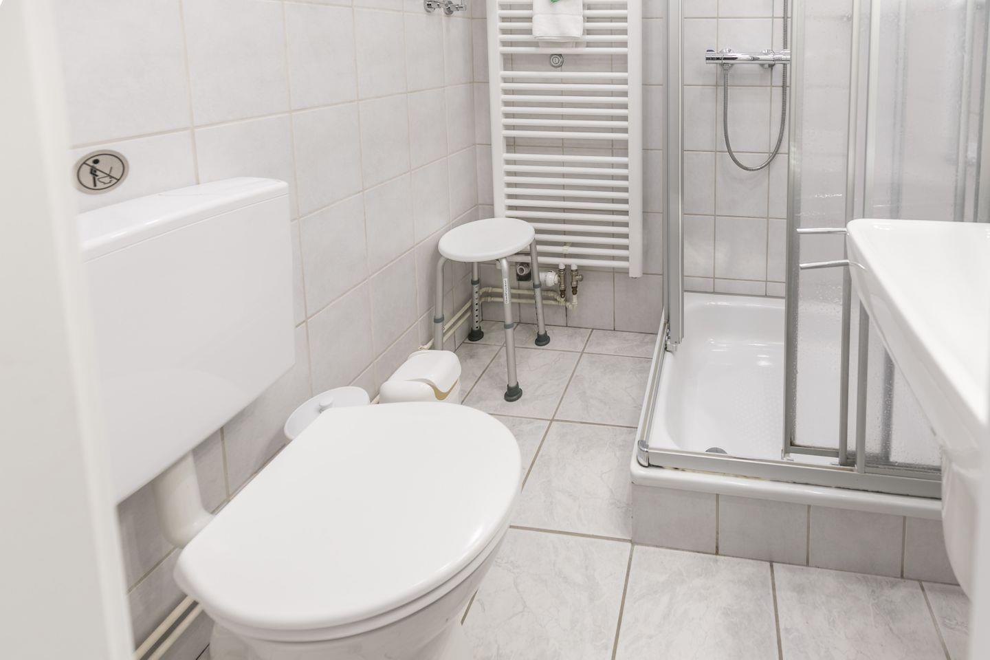 Duschbad, WC, Waschbecken, Spiegelschrank und Kosmetikspiegel, Fön, Duschhocker und Haltegriff, Abluft