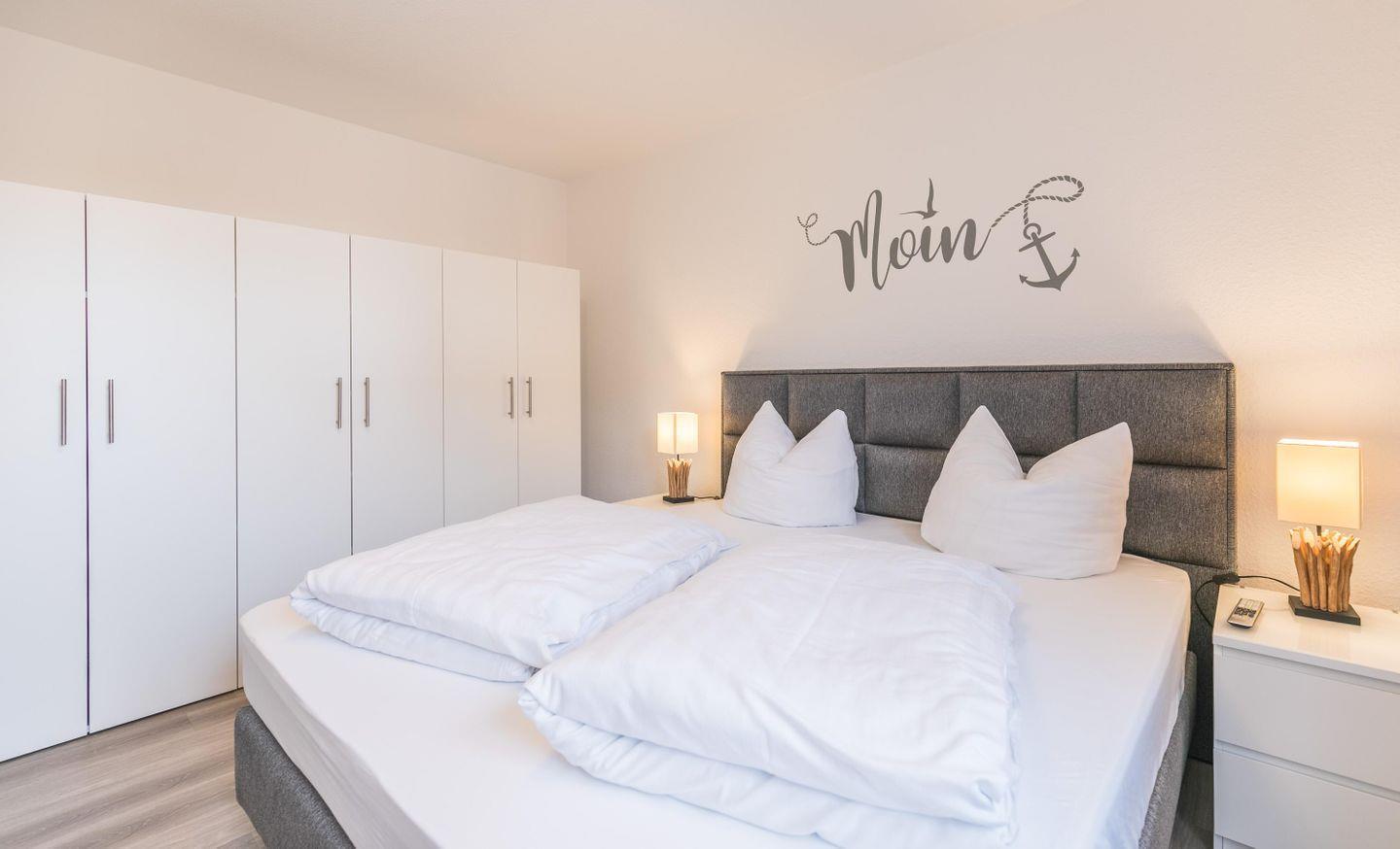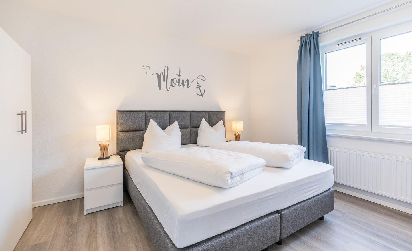 Im Hauptschlafzimmer steht ein gemütliches Boxspringbett für erholsame Nächte bereit. Das zweite Schlafzimmer bietet insgesamt drei Schlafmöglichkeiten: zwei Einzelbetten und eine ausziehbare Matratze. Letztere ist für Kinder geeignet.