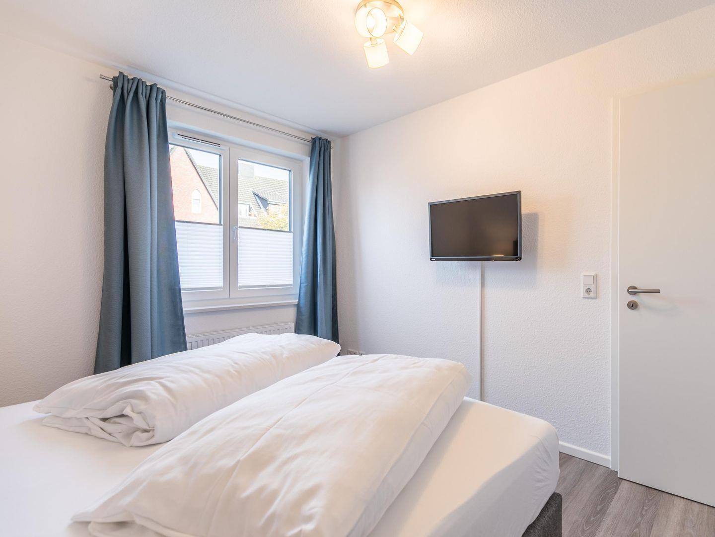 Boxspringdoppelbett mit durchgehender Matratze, Nachttische + Lampen, Flachbild-TV, Kleiderschrank, Gardinen