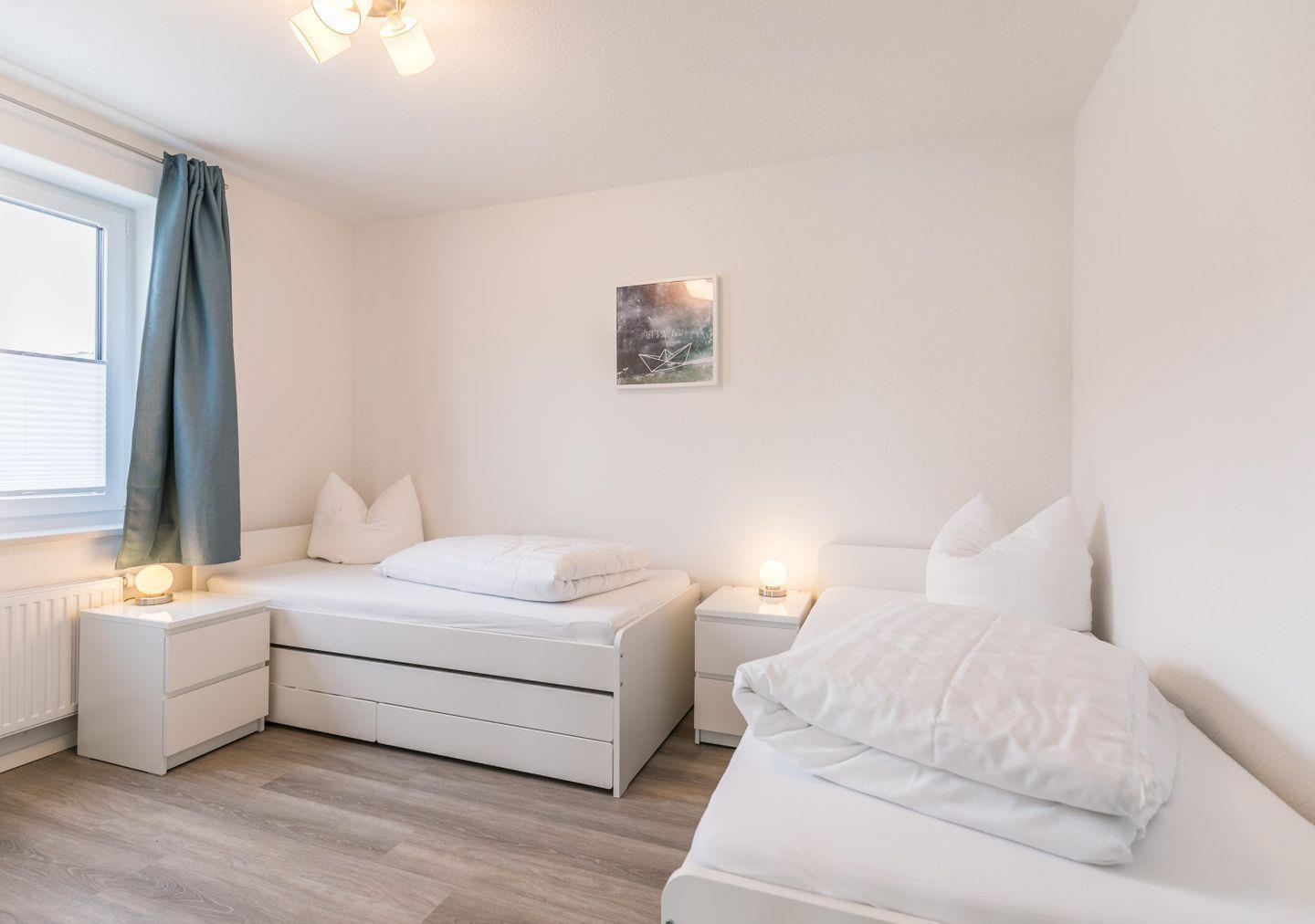 2 Einzelbetten und einer zusätzlich ausziehbaren Matratze, Nachttische + Lampen, Kleiderschrank, Gardinen