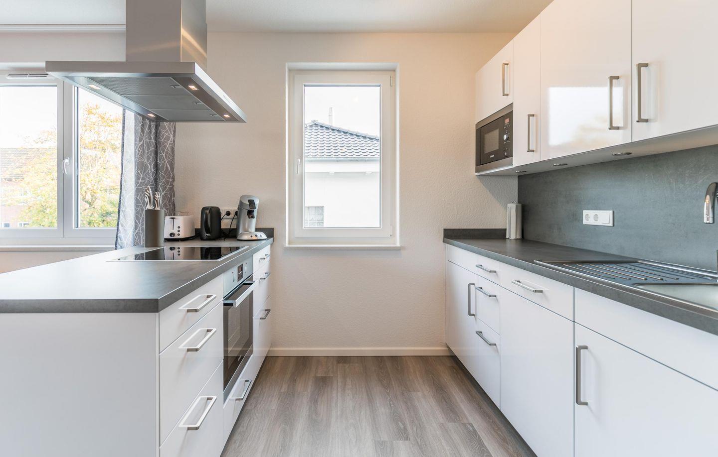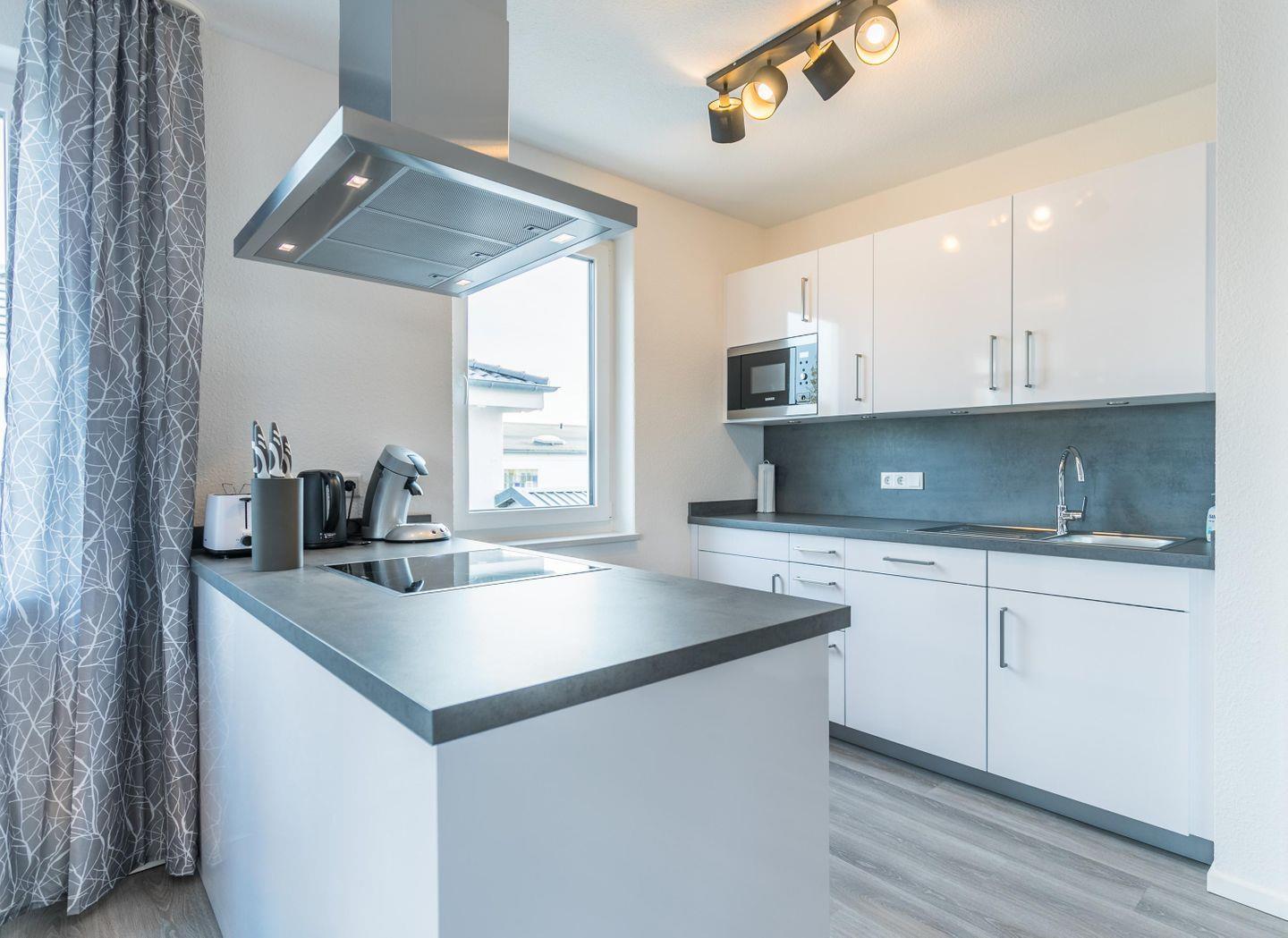 Induktionskochfeld, Abluft, Backofen, Kühlschrank m. Gefrierfach, Geschirrspüler, Mikrowelle, Wasserkocher, Toaster, Kaffeemaschine (Filter + Pad-Maschine, in einem Gerät)