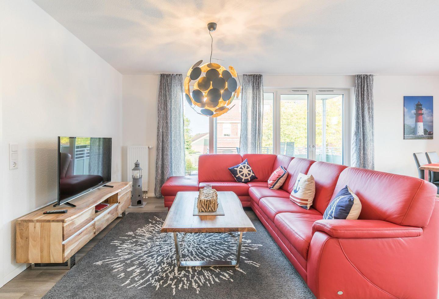 Ledersofa, Tisch, Zugang zum Balkon, Kommode, Esstisch + Stühle, DAB+-Radio mit Internet und Bluetooth-Funktion