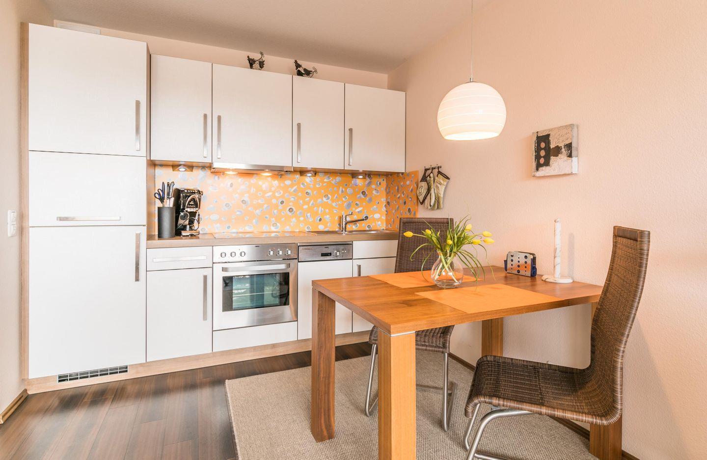 Ceran-Kochfeld, Backofen, Mikrowelle mit Grill, Geschirrspüler, Kühlschrank mit Gefrierfach, Kaffeemaschine, Espressomaschine, Cafissimo, Wasserkocher, Toaster, Eierkocher, Teemaschine, Rührgerät, vollständiges Geschirr/Topf-Set