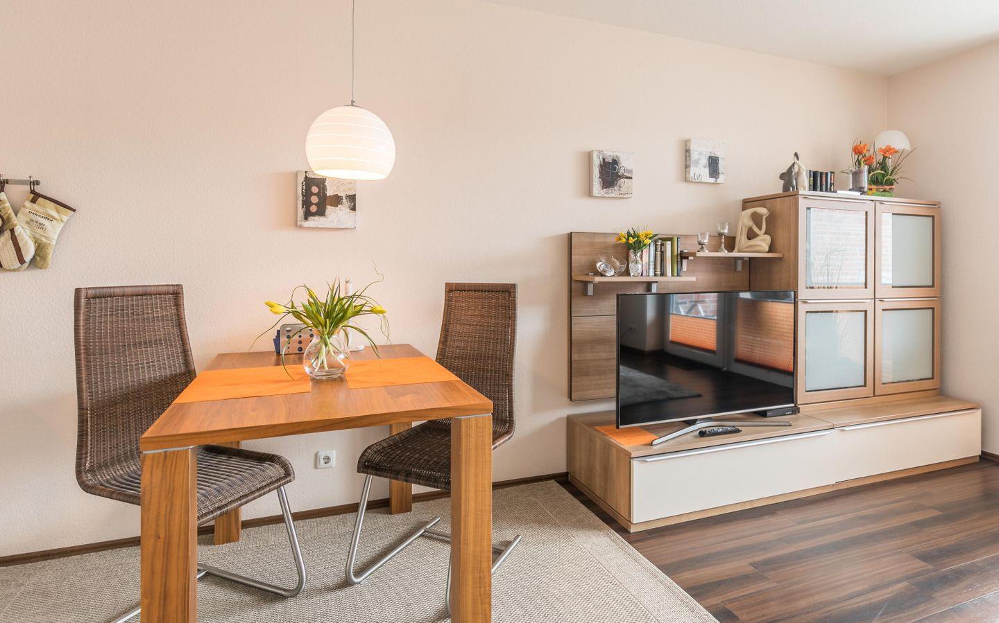 Das separate Schlafzimmer sorgt mit einem bequemen Bett und Stauraum für erholsame Nächte, außerdem sorgt ein zweiter TV für Unterhaltung. Im modernen Duschbad starten Sie entspannt in den Tag. WLAN hält Sie auf Wunsch online; in der Tiefgarage steht ein fester Stellplatz zur Verfügung, der Aufzug bringt Sie bequem zur Wohnung.