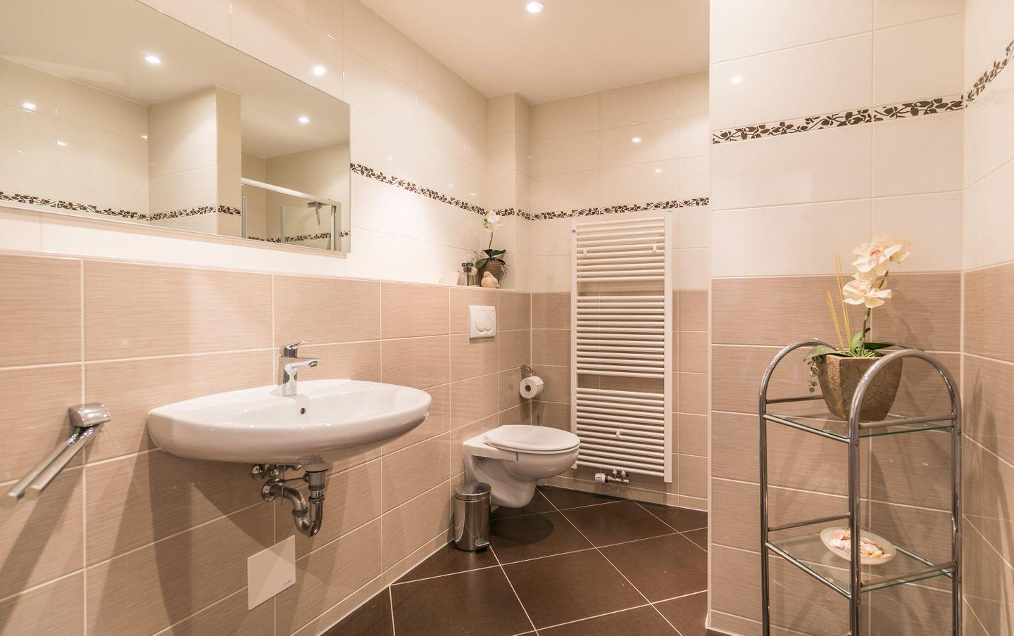 Dusche mit flachem Einstieg, WC, großer Spiegel, Ablagen, Föhn, Fußbodenheizung, Handtuchwärmer