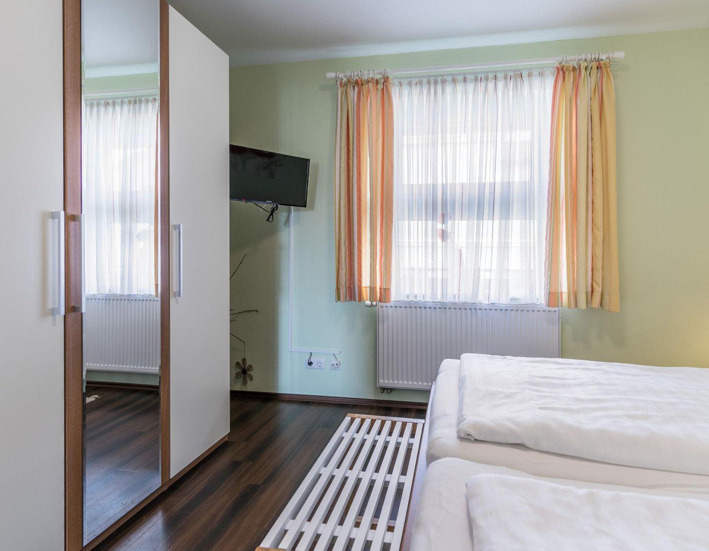 Doppelbett (2× 100×200, getrennte Matratzen), Flachbild-TV, Kleiderschrank, Nachttische/Leuchten, elektrische Rollläden, Verdunkelung