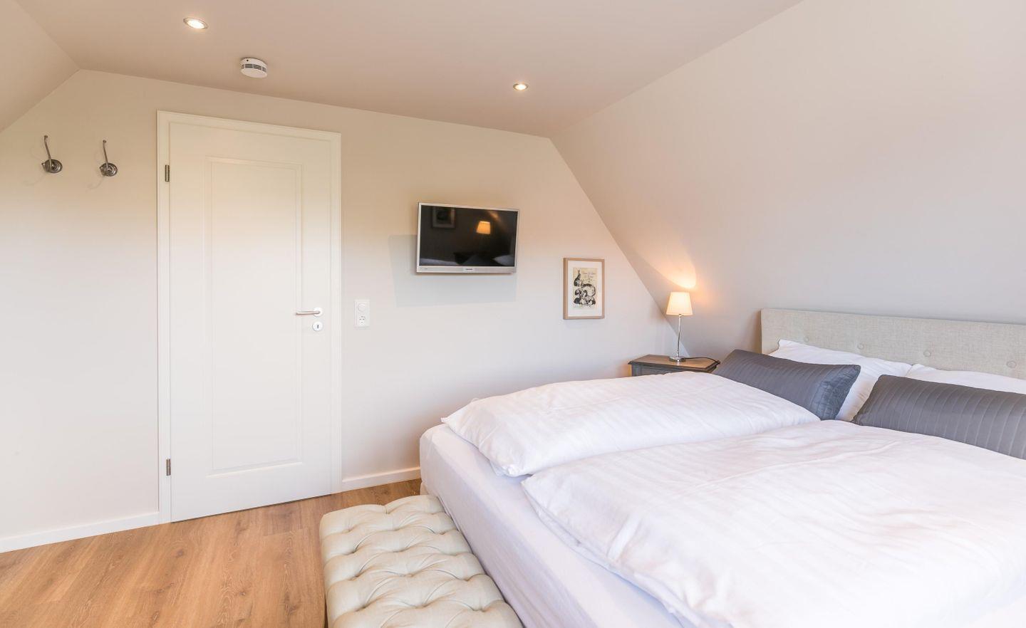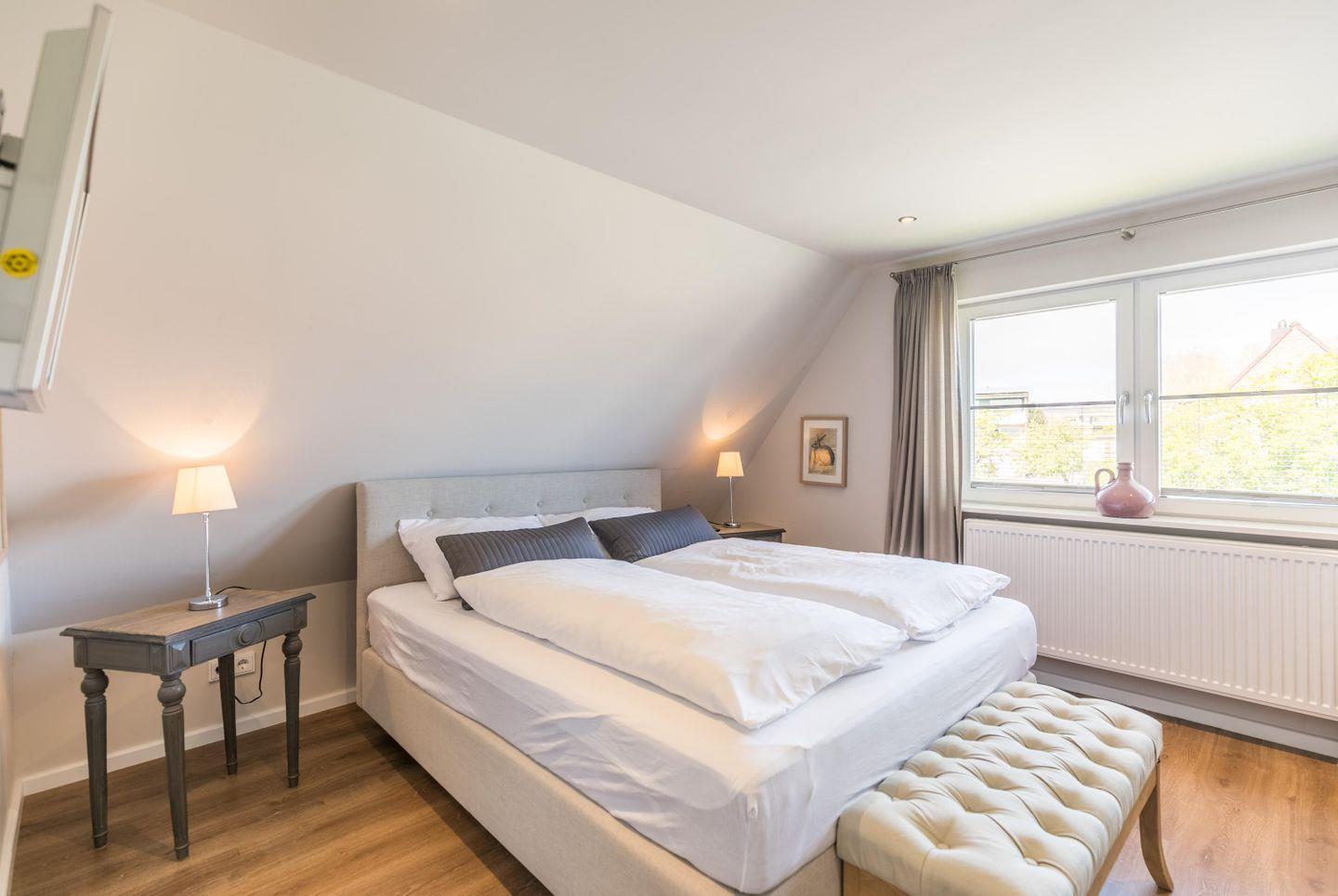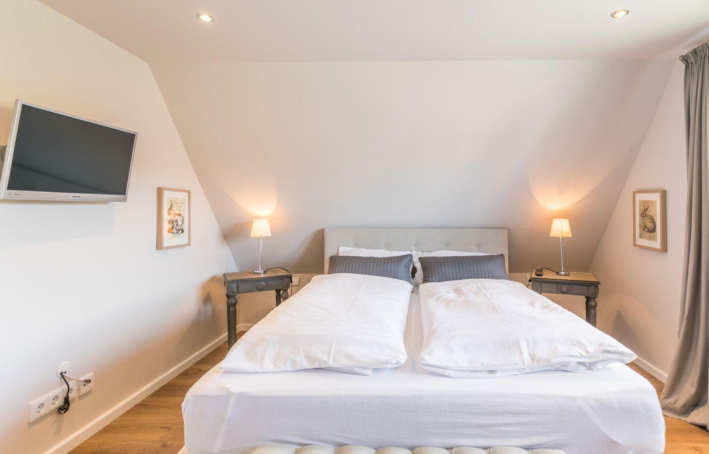 Boxspring-Doppelbett (1,60 × 2,00 m), Einbauschrank, Nachttische, Lampen, Flachbild-TV, Sitzbank, Korbstuhl, Plissee