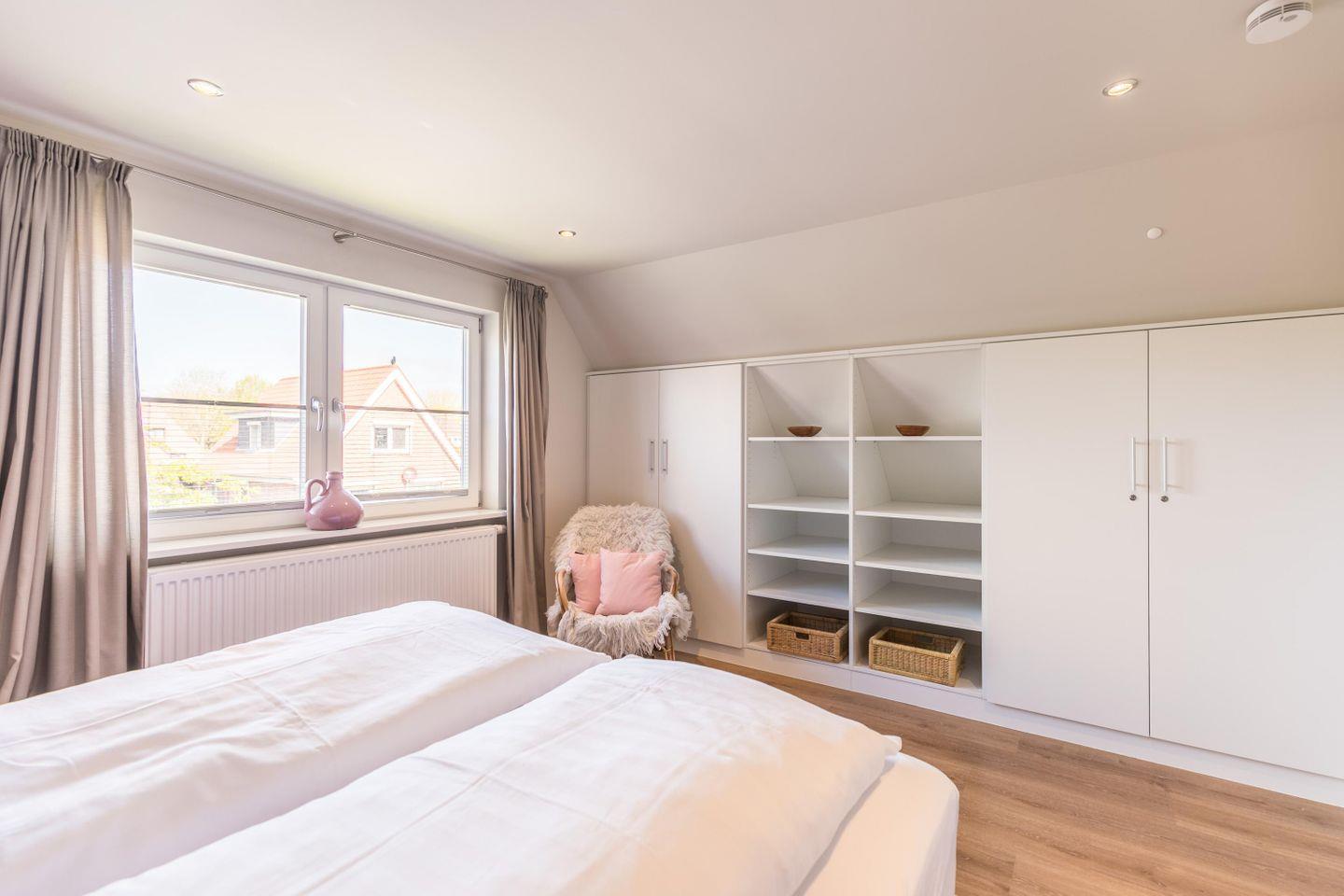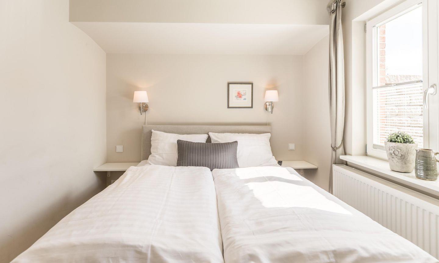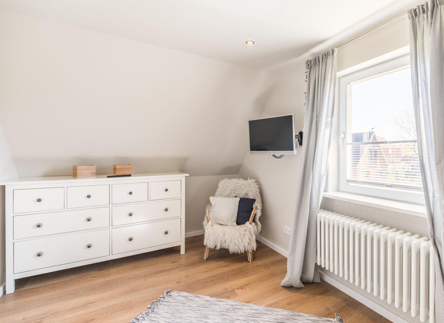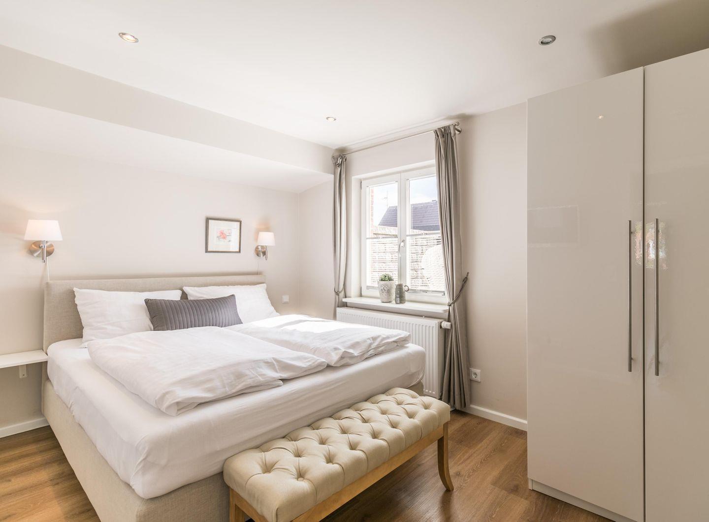 Boxspring-Doppelbett (1,60 × 2,00 m), Einbauschrank, Nachttische, Lampen, Flachbild-TV, Sitzbank, Korbstuhl, Plissee