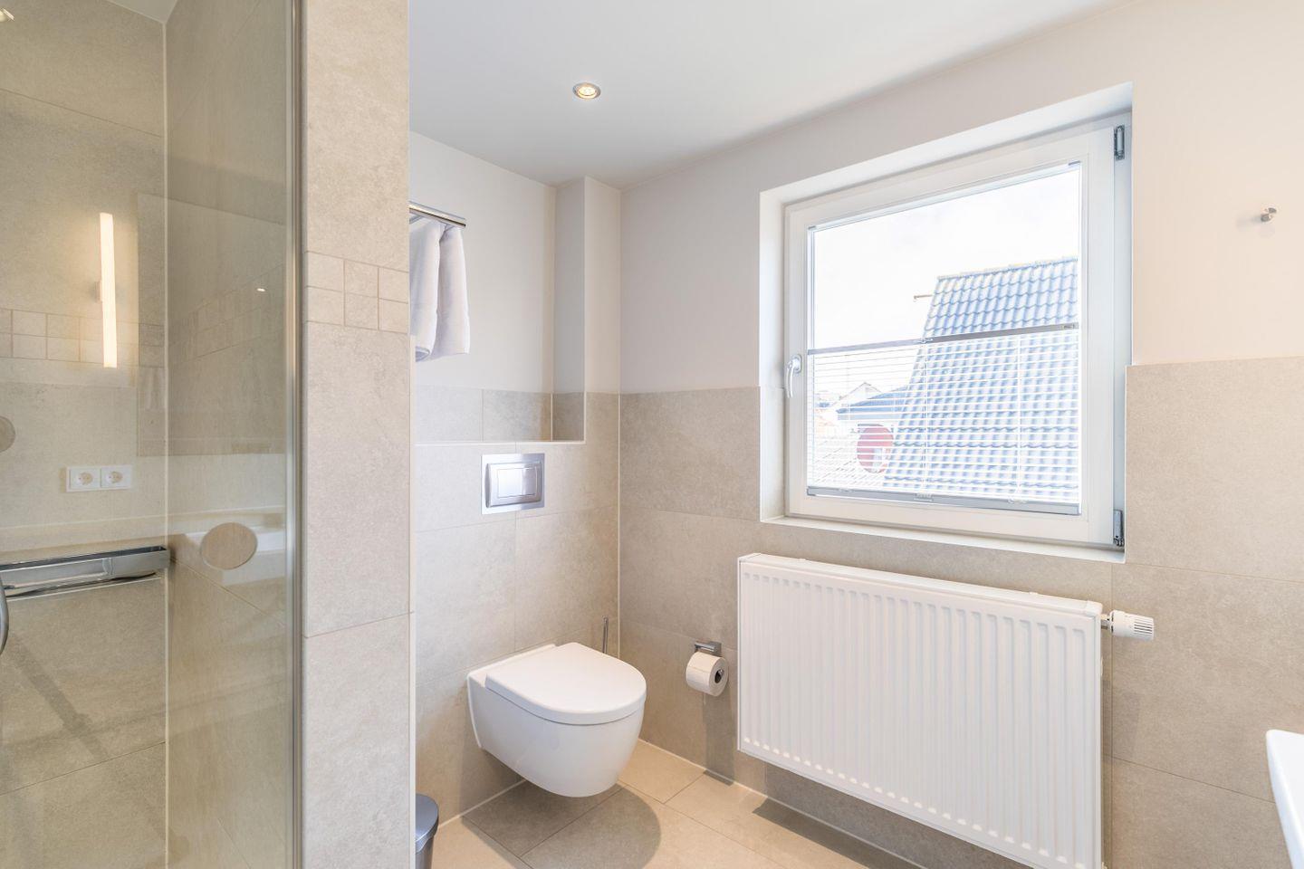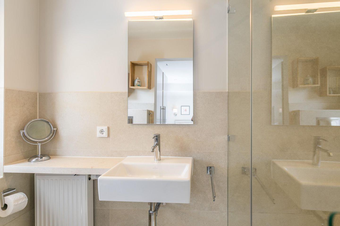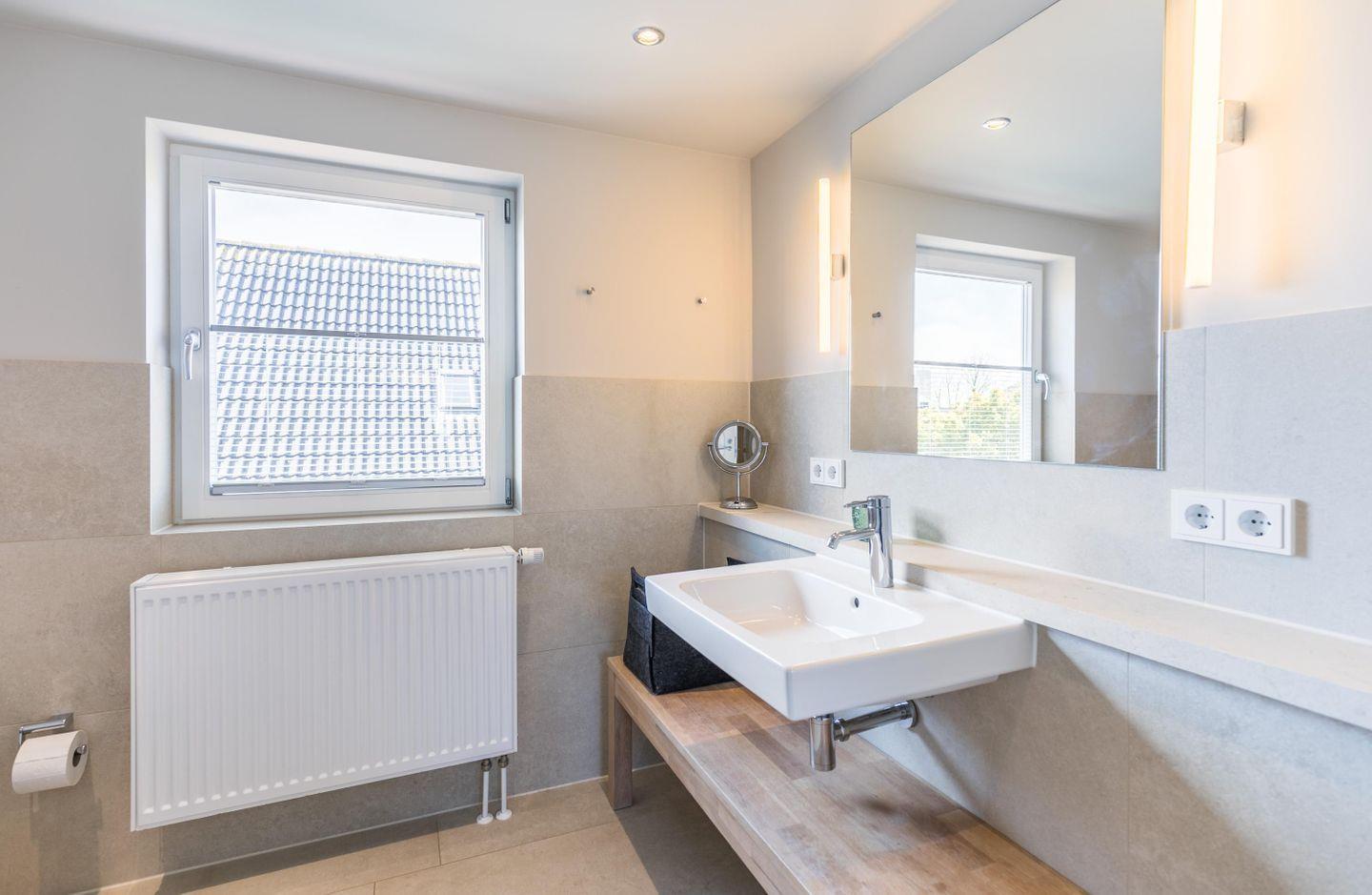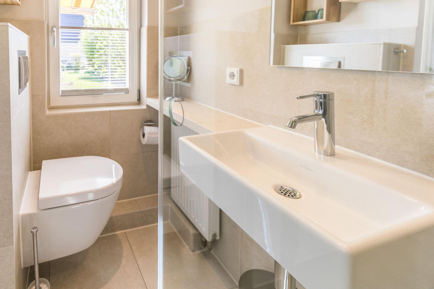 Ebenerdige Dusche, WC, Spiegel, Kosmetikspiegel, Föhn, Fenster, Waschbecken