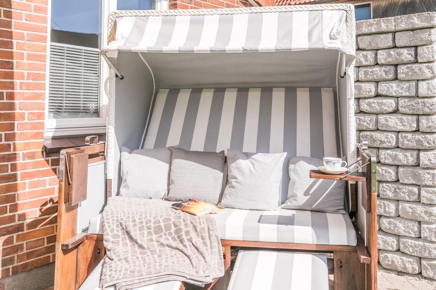 WLAN, 1 kostenloser Parkplatz, möblierte Terrasse, Strandkorb, zwei Sonnenliegen, elektrische Markise, Spiele und Bücher, Bügeleisen, Bügelbrett, Waschmaschine, Wäscheleine, Wäsche optional buchbar