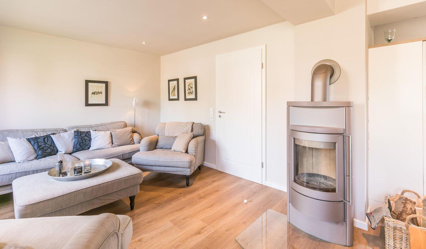 Sofa und zwei Sessel, Flachbild-TV, Blu-ray-Player, Sitzecke, Kaminofen, Hocker, Zugang zur Terrasse/Garten
