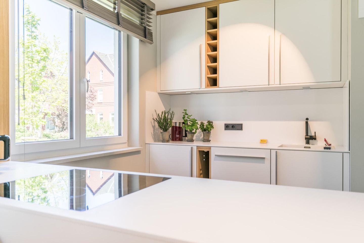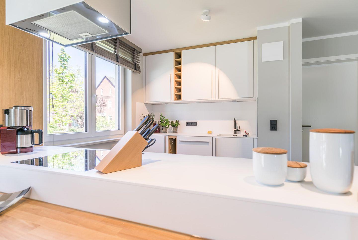 Induktionskochfeld, Abluft, Backofen, Geschirrspüler, Kühlschrank mit Gefrierfach, Toaster, Wasserkocher, Kaffeemaschine, Eierkocher