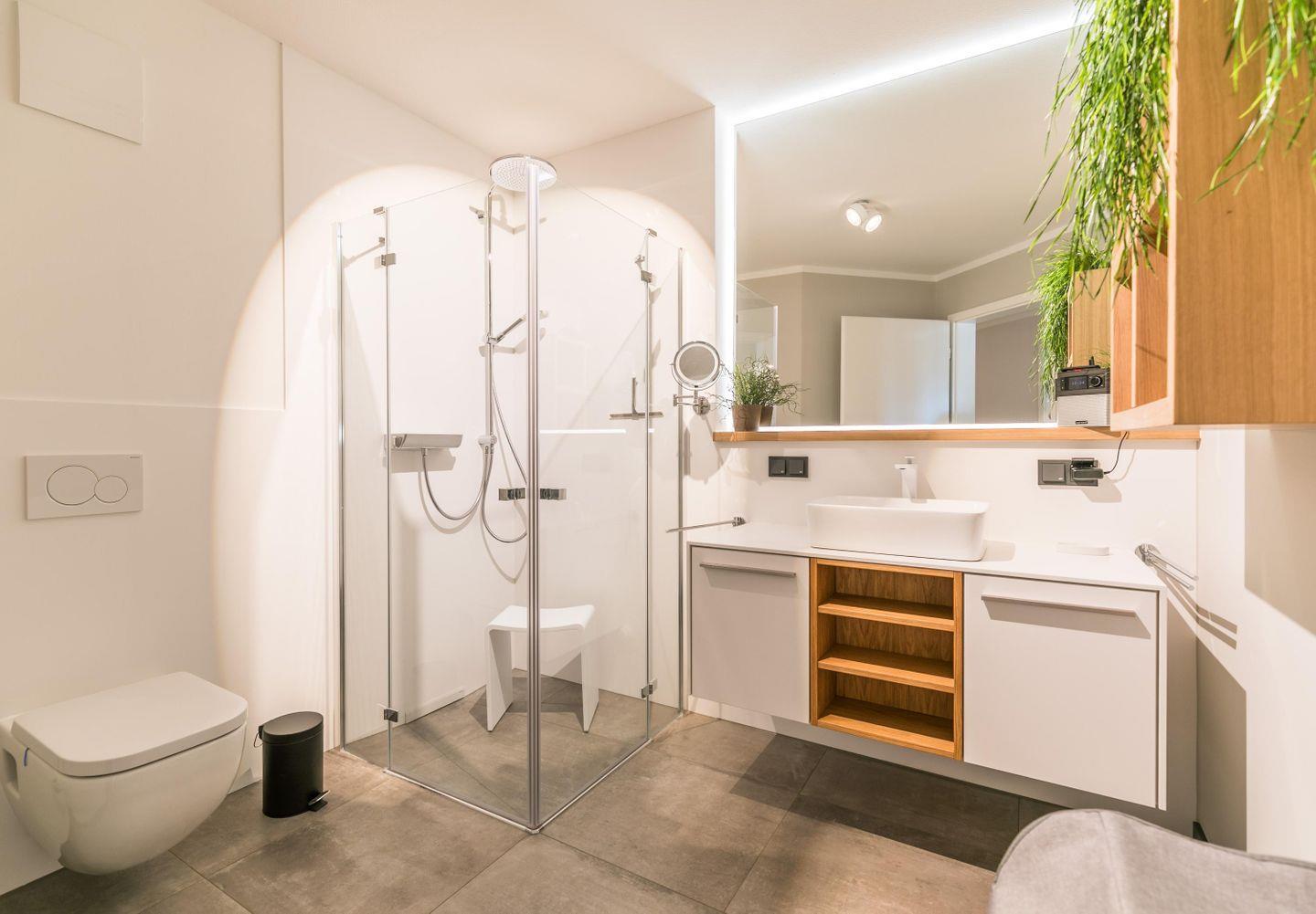 Bodentiefe Dusche, Duschhocker, WC, großer Spiegel, Kosmetikspiegel, Hängeschrank, Handtuchtrockner, Fön, Abluft, Regal, Radio