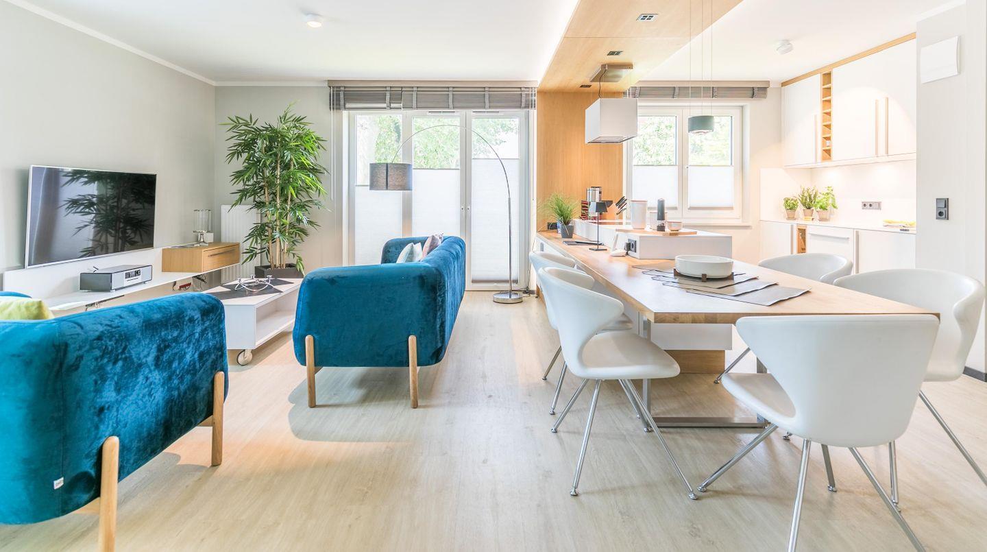 Sie werden im warmbeleuchteten Eingangsbereich empfangen. Durch eine Glasfront kommen Sie in die offene Wohnküche. Ein außerordentliches Ambiente erwartet Sie:
