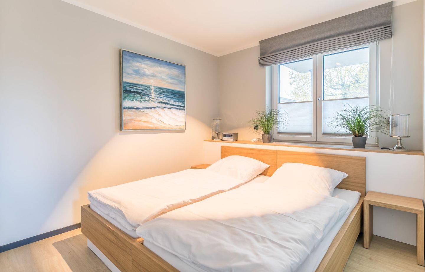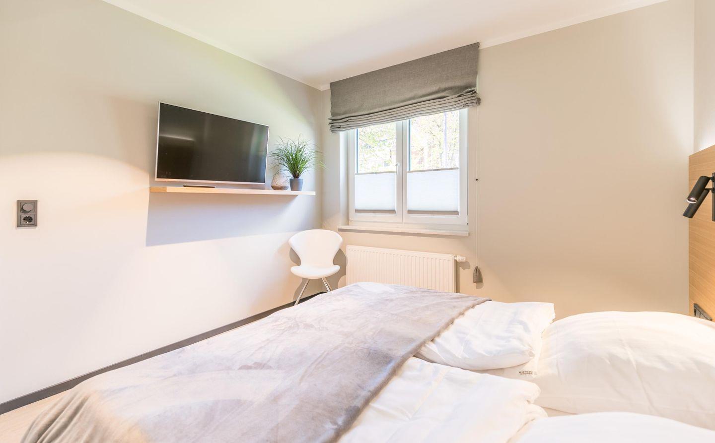 Doppelbett mit getrennten Matratzen (je 2,00m x 0,90m), Nachttische + Lampen, großer Kleiderschrank, Flachbild-TV, Verdunkelungsmöglichkeit + Plissee, Fliegengitter
