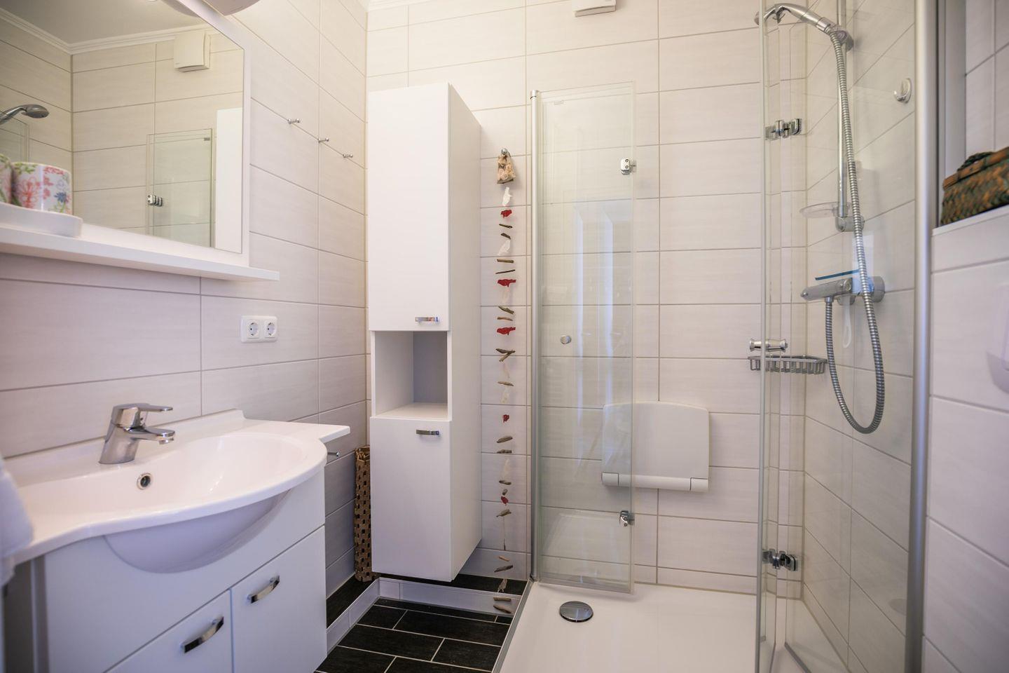 Dusche (leicht erhöhter Einstieg), WC, Waschbecken, Spiegel mit Ablage, Hochschrank, Kosmetikspiegel, Föhn, Handtuchwärmer, Duschsitz, Lüfter
