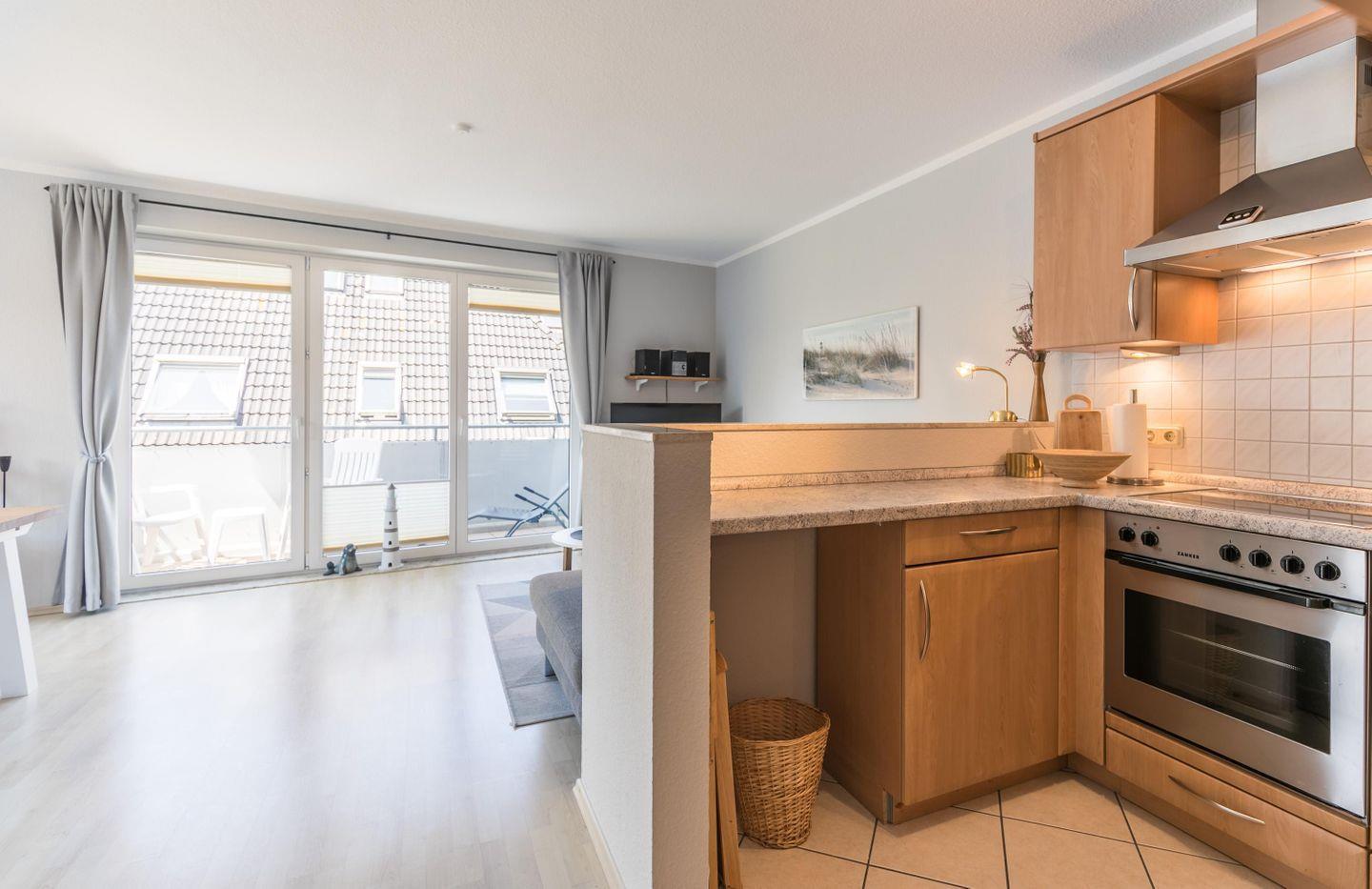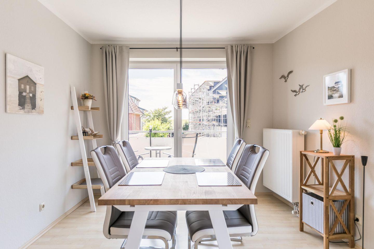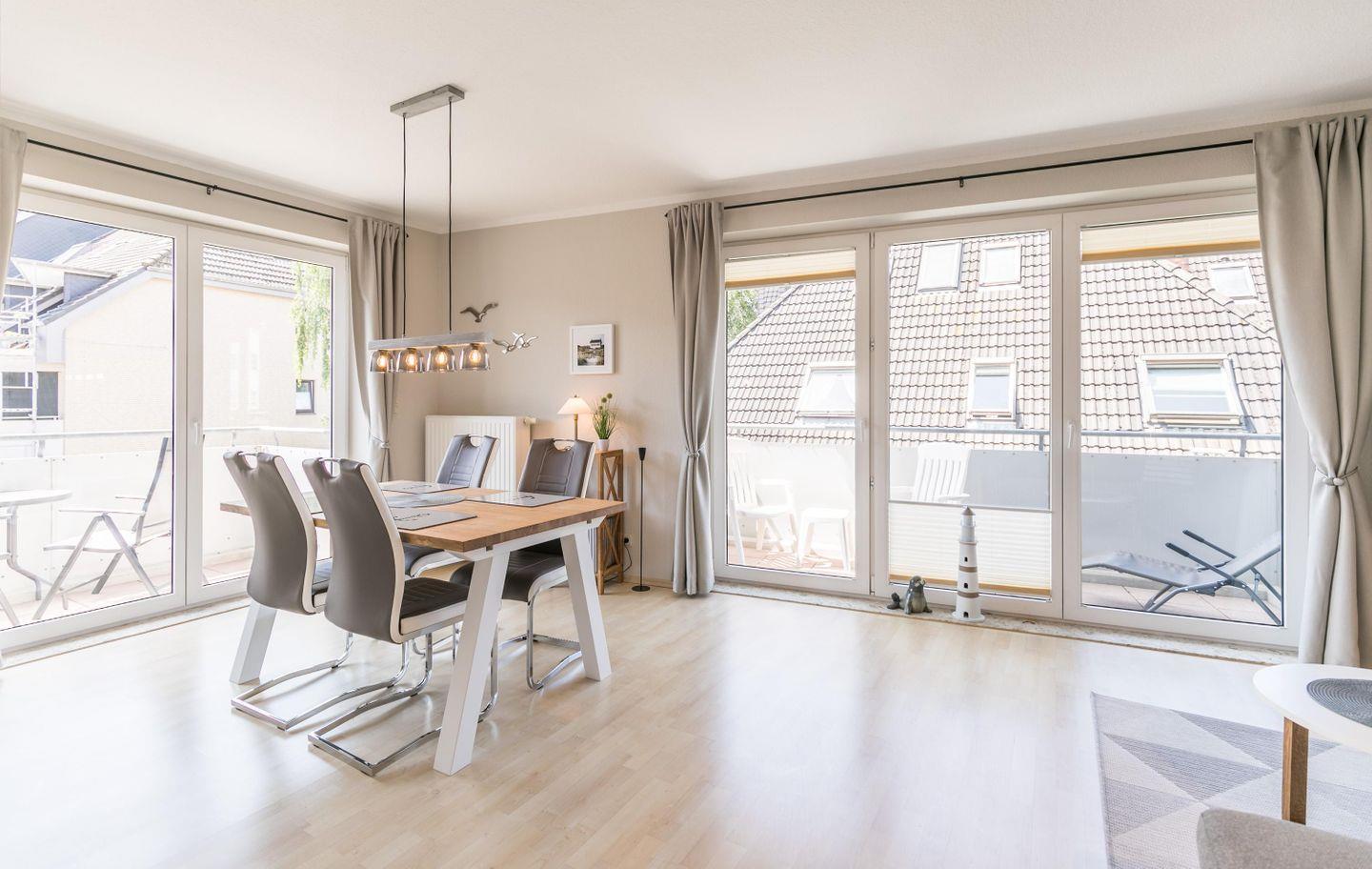 Der helle Wohnbereich mit Deichblick lädt zum Entspannen ein. Besonders angenehm: zwei Balkone, auf denen Sie je nach Tageszeit zwischen Sonne und Schatten wählen können.