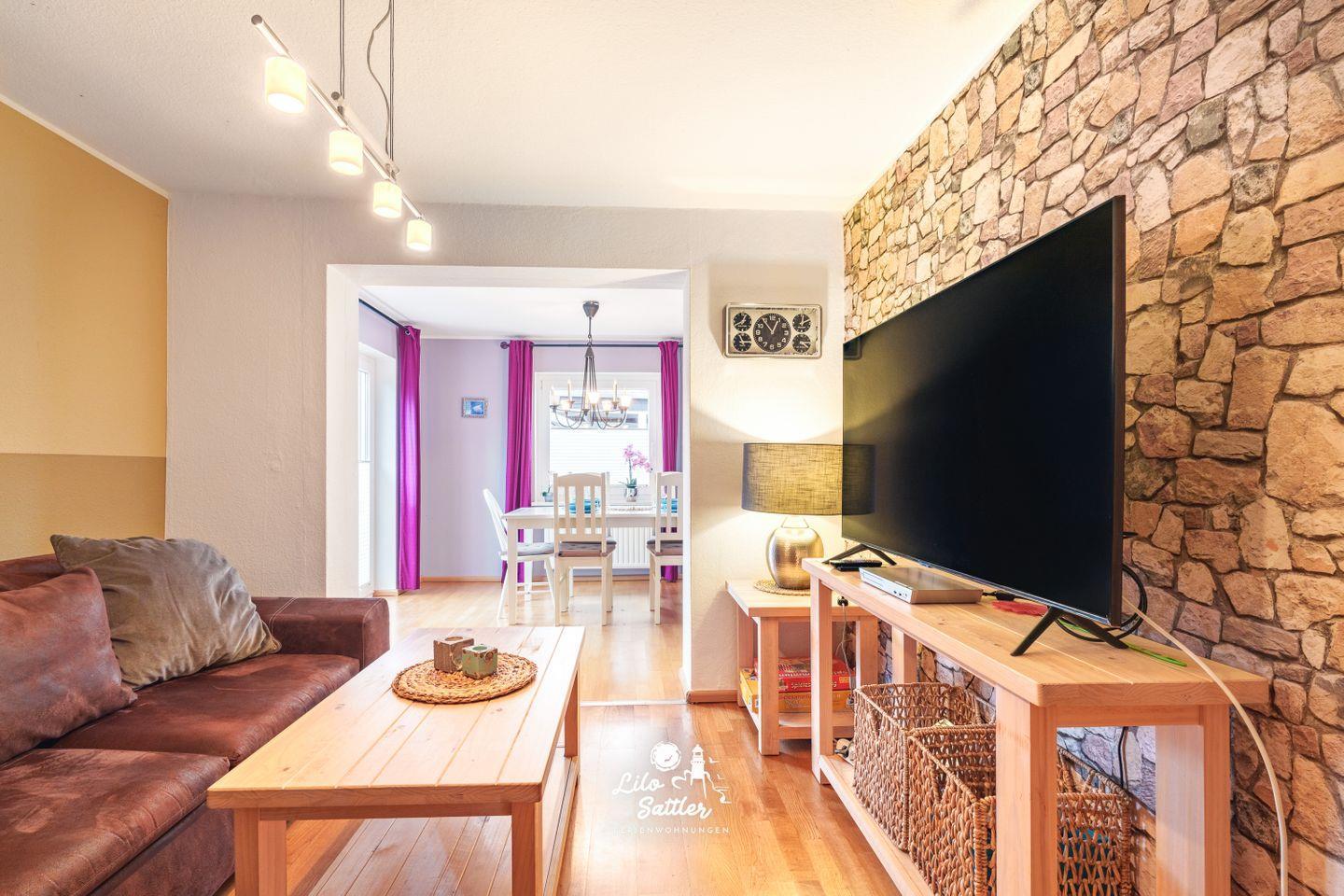 Sofa-Sitzecke, Couchtisch, TV, Esstisch; Zugang zur Terrasse/Garten.