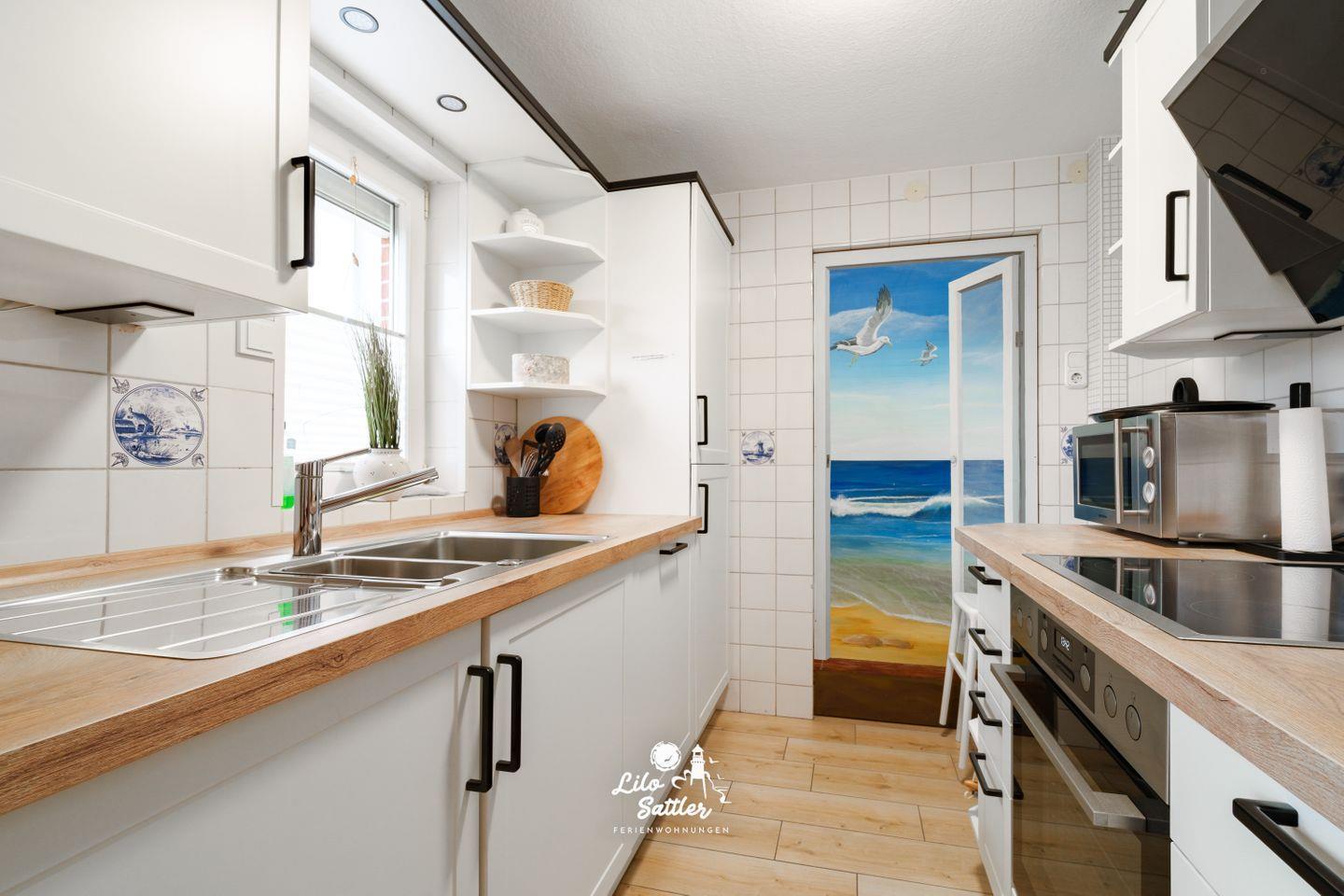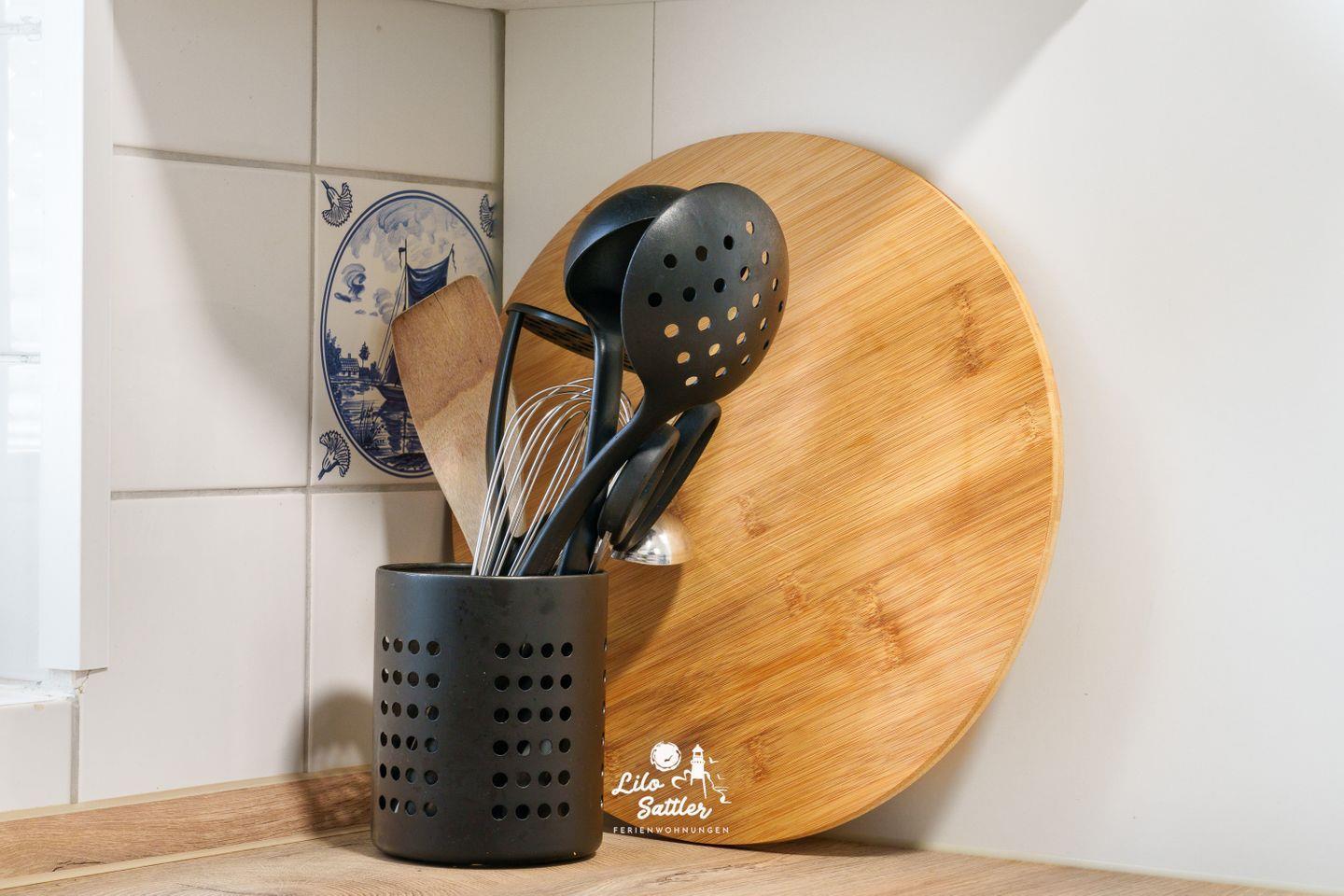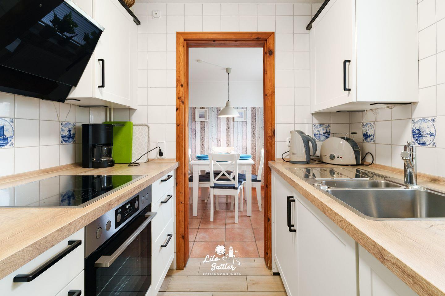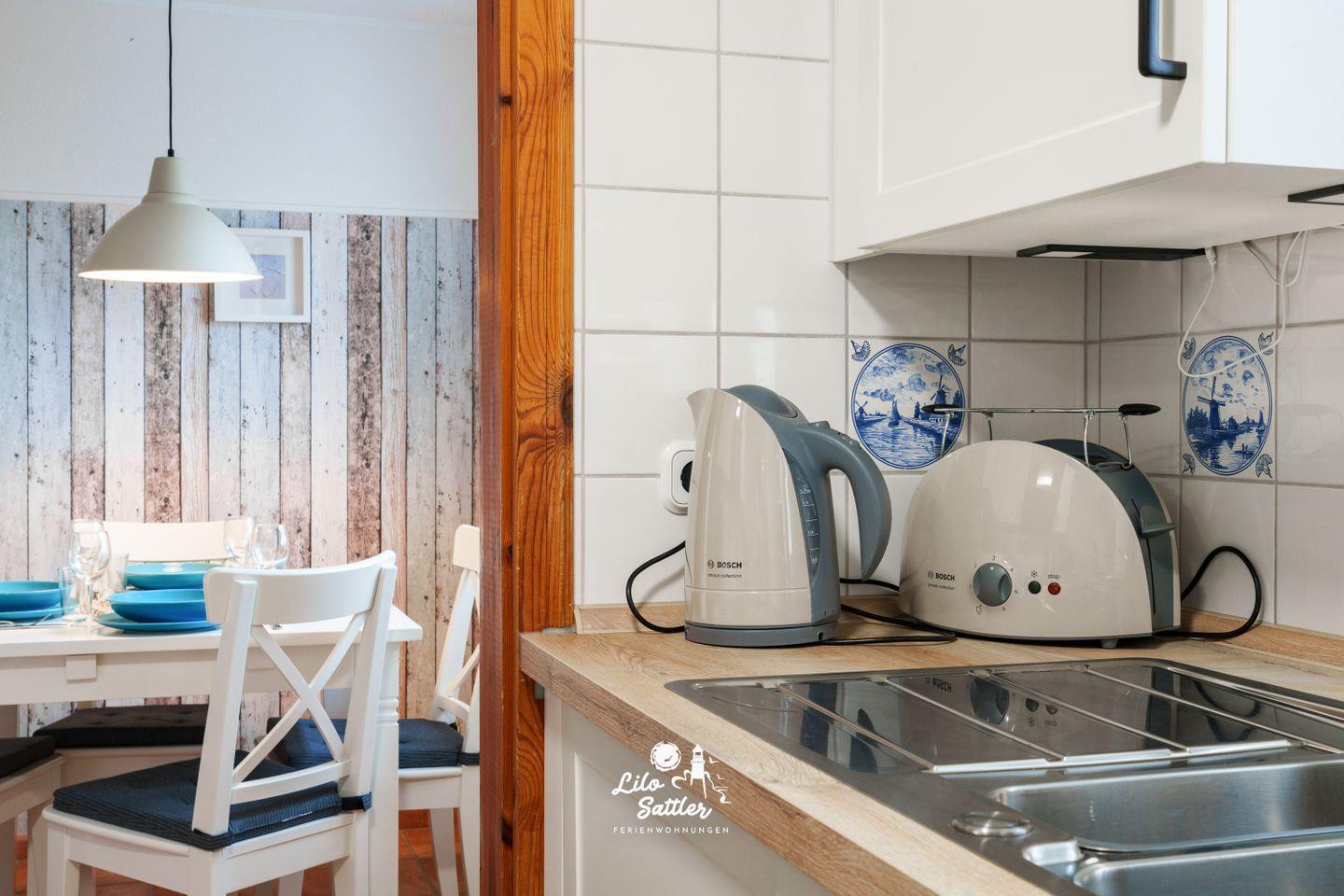 Ceran-Kochfeld, Backofen, Geschirrspüler, Kühlschrank, zusätzlicher Gefrierschrank, Mikrowelle, Kaffeemaschine, Wasserkocher, Toaster, Koch-/Essgeschirr.