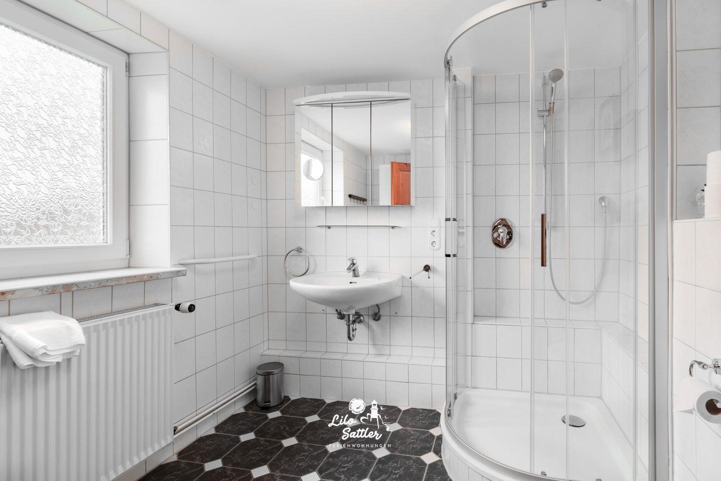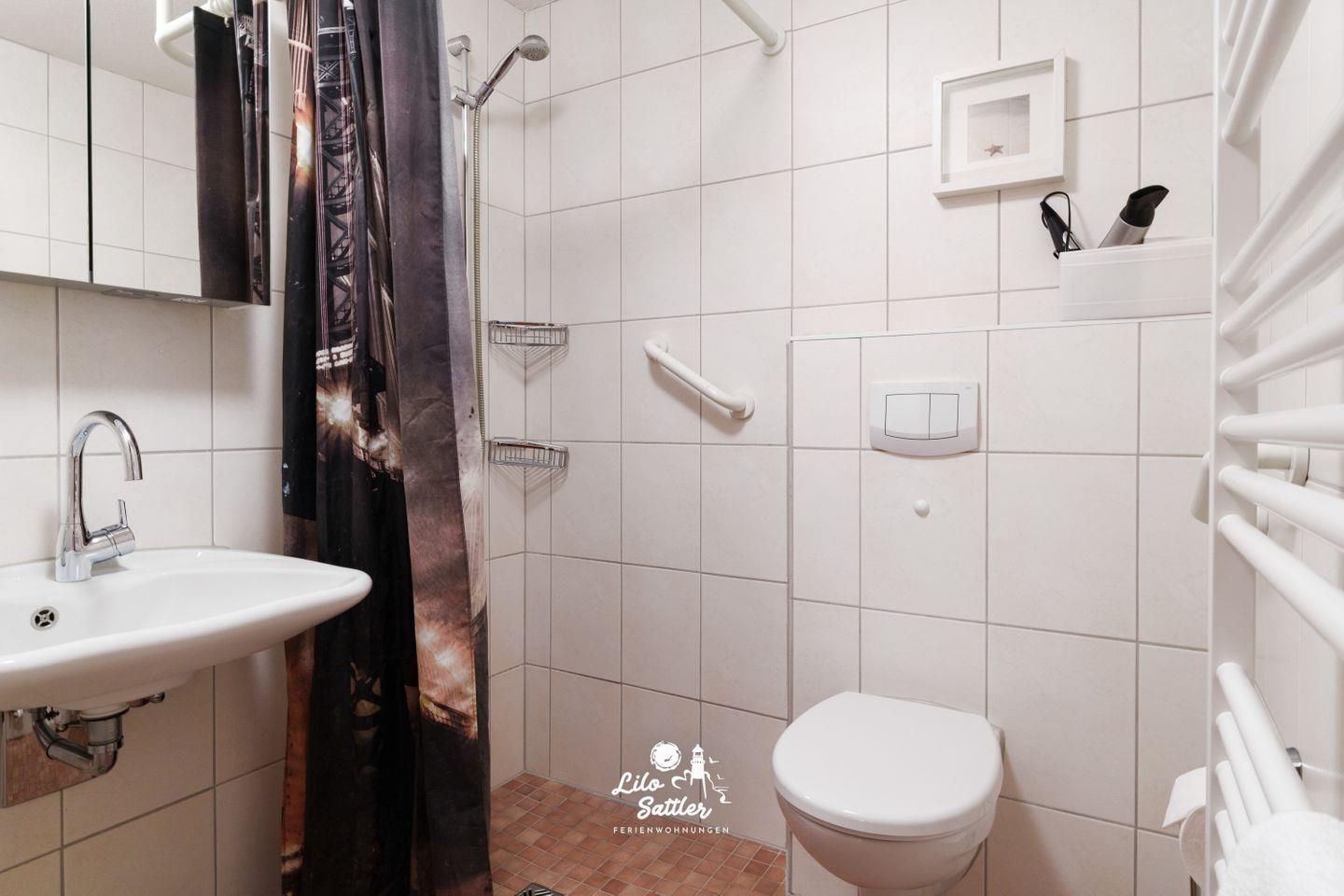Dusche (flacher Einstieg), WC, Waschtisch, Spiegel, Föhn, innenliegend.