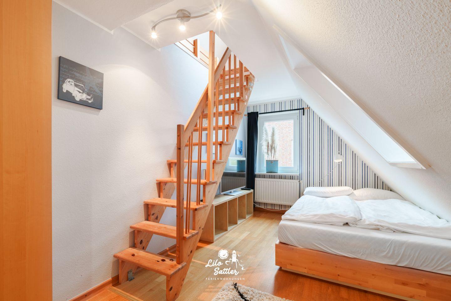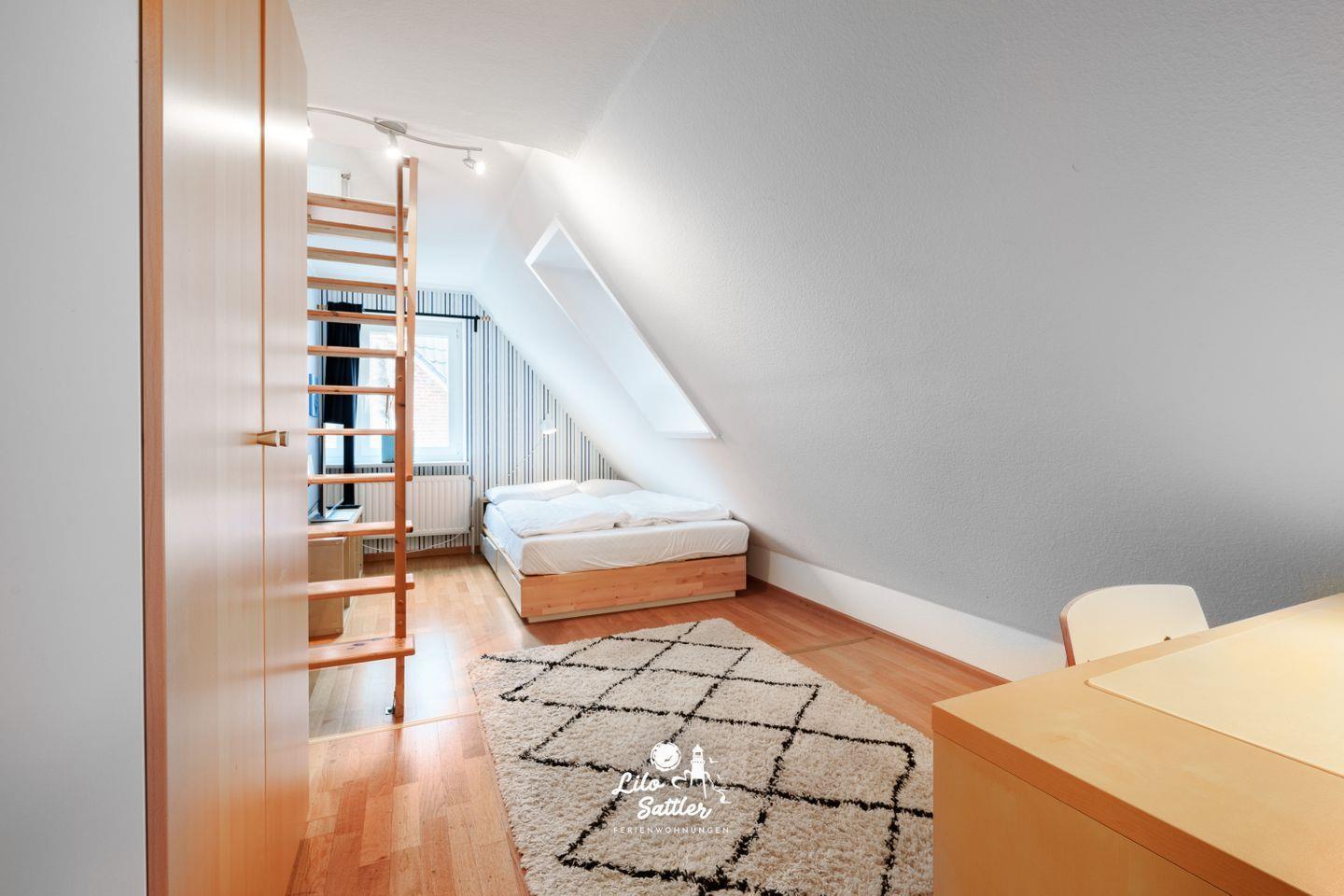 Bett 140×200 cm, zwei Wandschränke, Schreibtisch, Flachbild-TV, Zugang zum Spielboden.