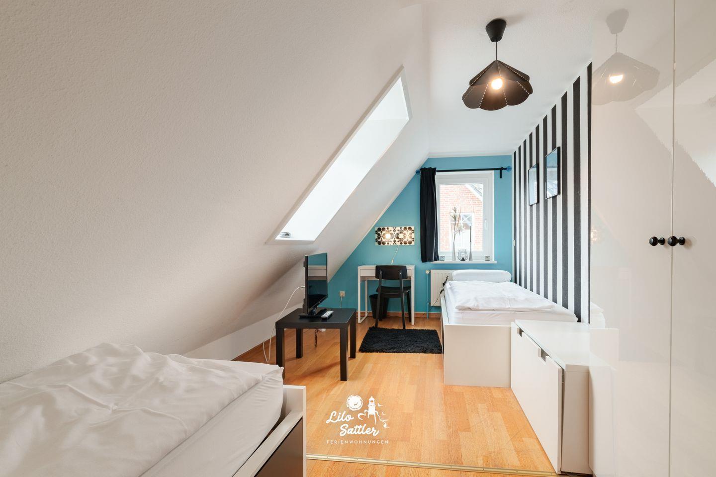 2 Einzelbetten 90×200 cm, Schrank, Schreibtisch, Flachbild-TV.