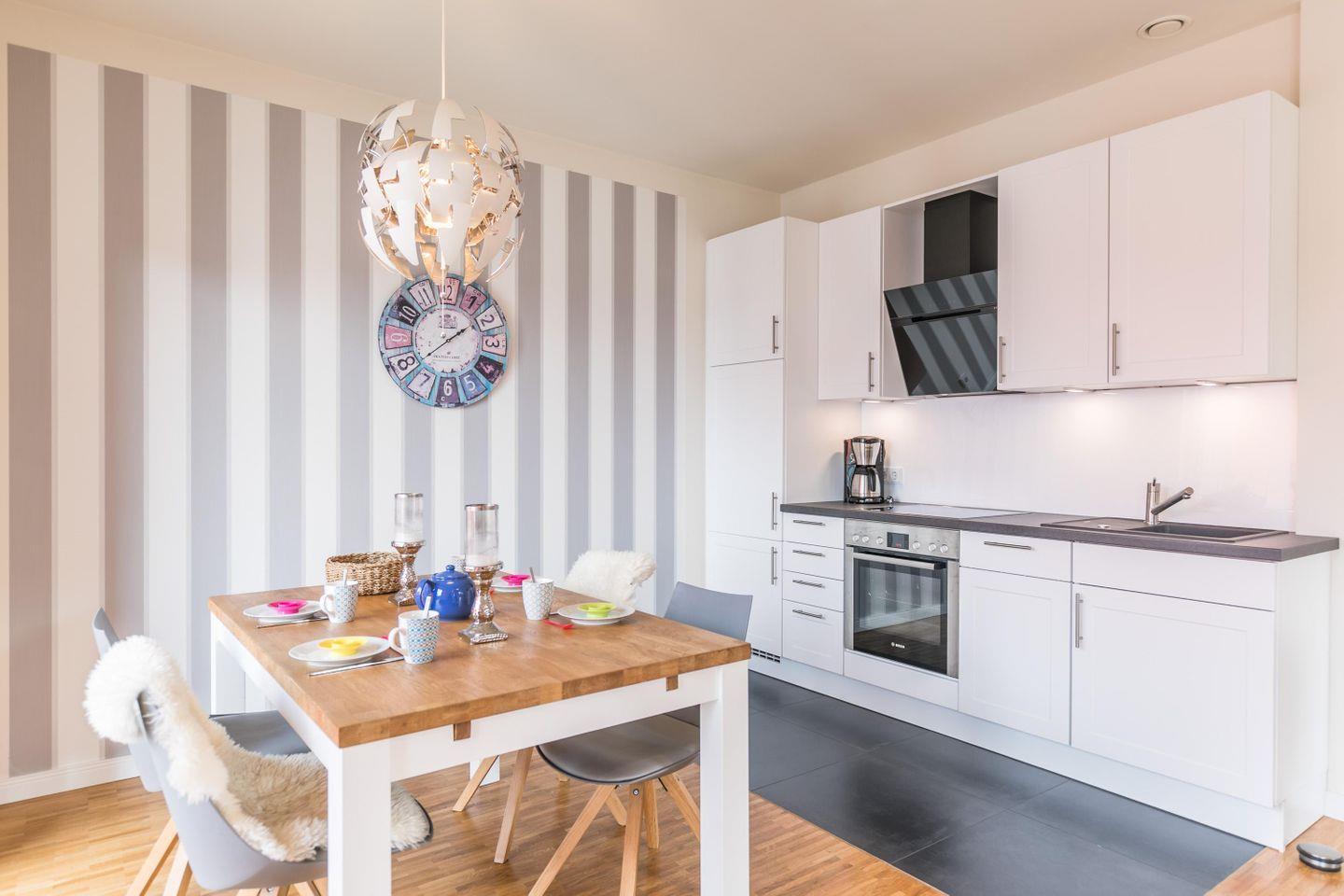 Backofen, Ceranfeld, Geschirrspüler, Kühlschrank mit Gefrierfach, Kaffeemaschine, Wasserkocher, Toaster, Dunstabzugshaube, Esstisch mit 4 Stühlen, Zugang zum kleinen Balkon mit 2 Sitzmöglichkeiten
