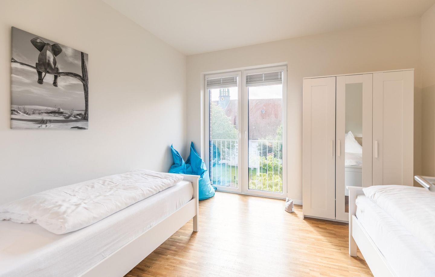 2 Einzelbetten, Nachttisch, Bettlampen, Kleiderschrank mit Spiegel, Sitzsack, Verdunkelungsplissee