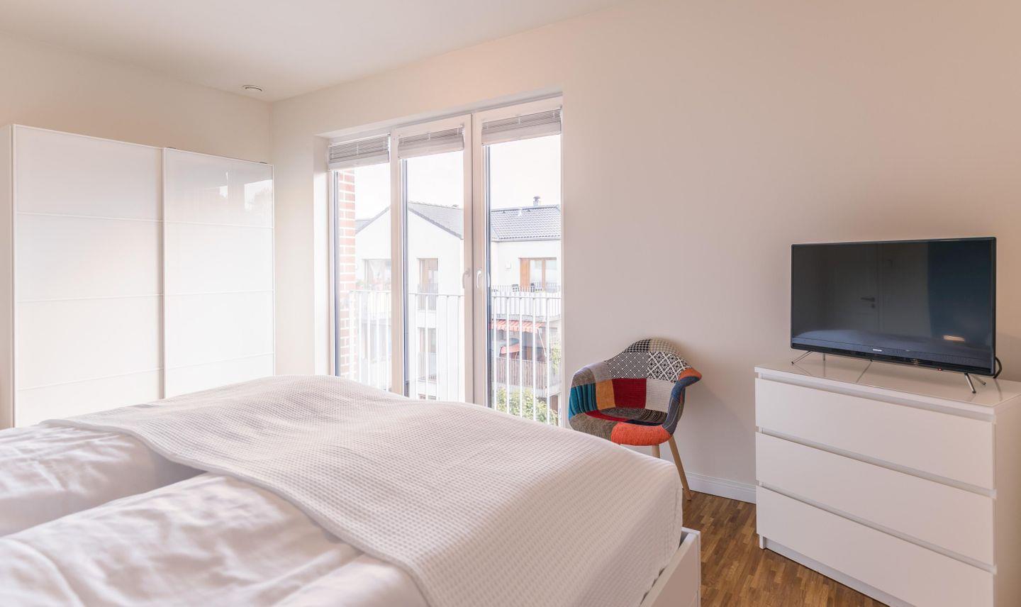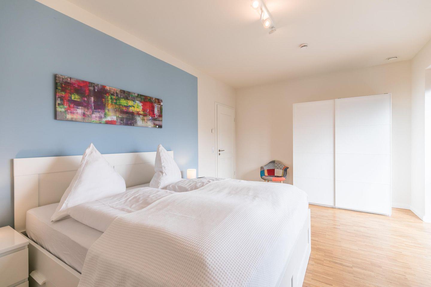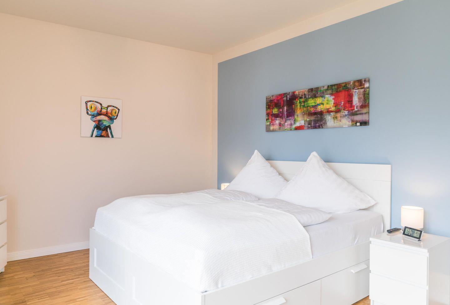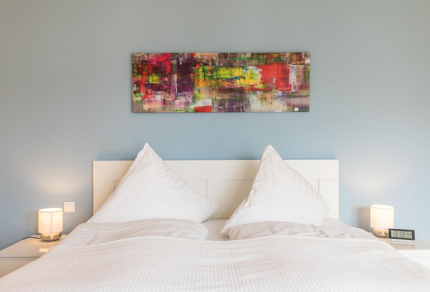 Die Wohnung verfügt über ein Schlafzimmer mit Doppelbett und einem weiteren Schlafzimmer mit zwei getrennt stehenden Einzelbetten.