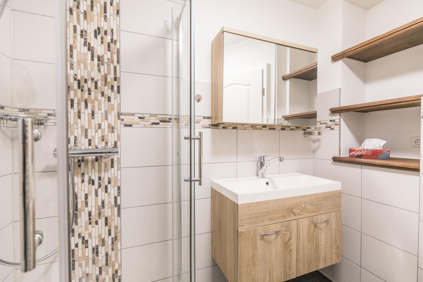 Dusche mit Duschwanne, Handtuchwärmer, Fön, Waschbecken, Spiegelschrank, WC, Fenster