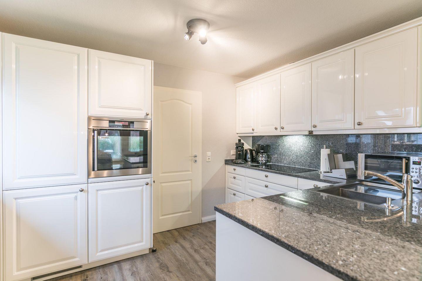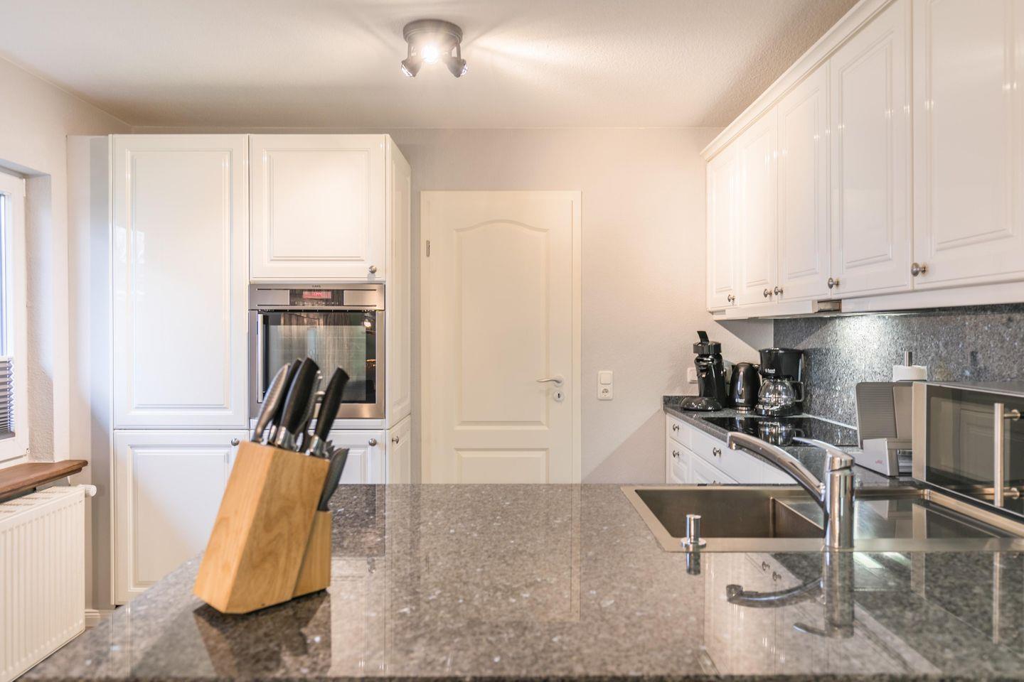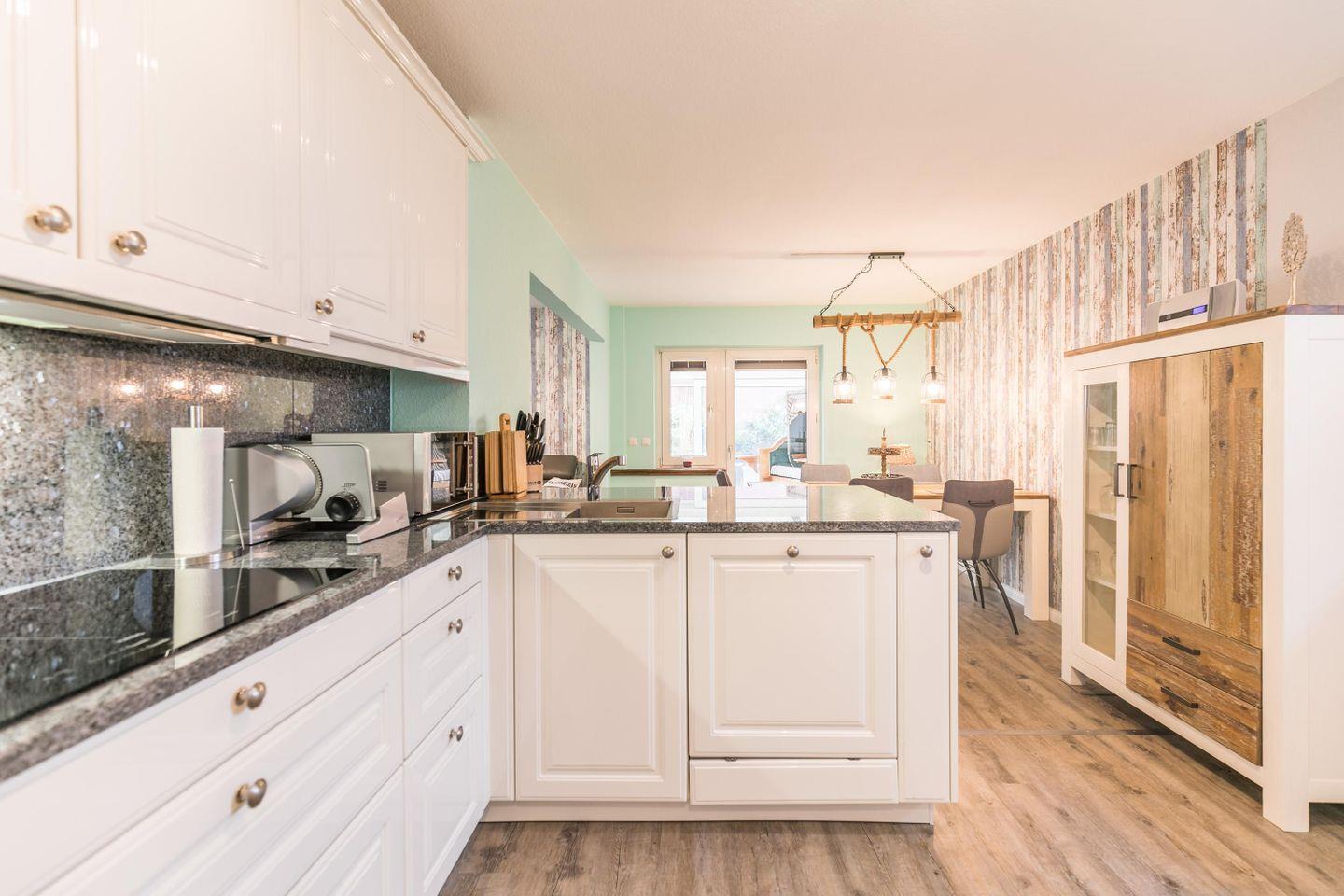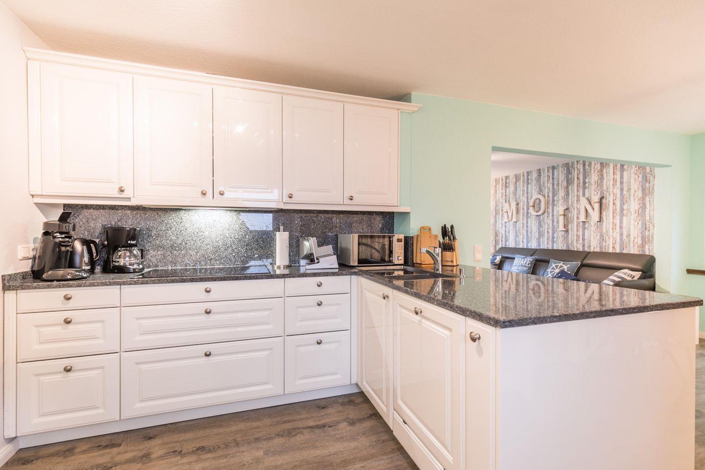 Induktionsfeld mit Abluft, Spüle, Kühlschrank mit Gefrierfach, Backofen, Geschirrspüler, Mikrowelle, Toaster, Wasserkocher, Kaffeemaschine (Filter), Senseo Padmaschine, Eierkocher, Brotschneidemaschine, Handmixer
