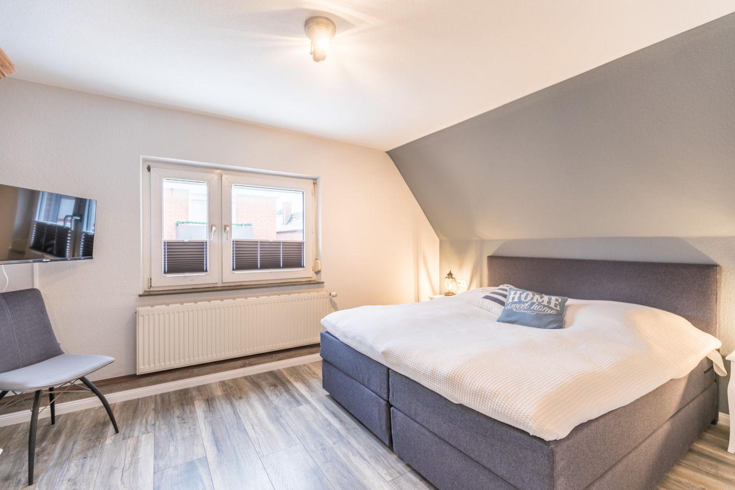 Boxspringdoppelbett mit durchgehender Topper-Matratze (1,80m x 2,00m), Nachttische + Lampen, Kleiderschrank 4 türig mit Ganzkörperspiegel, Flachbild-TV, Stuhl, Verdunkelungsplissee, Fliegengitter