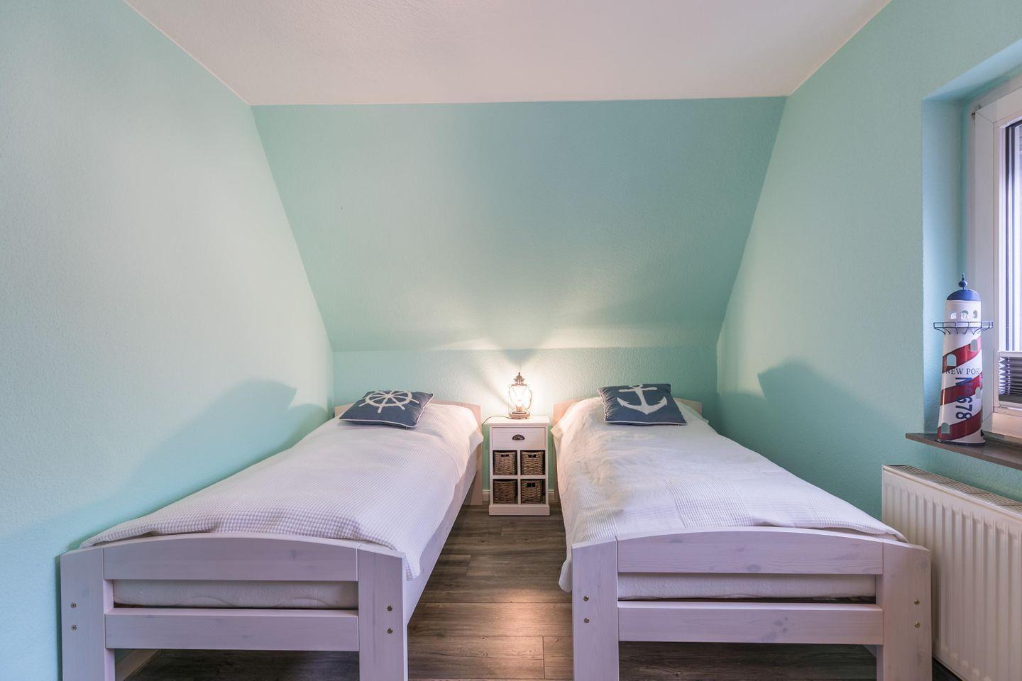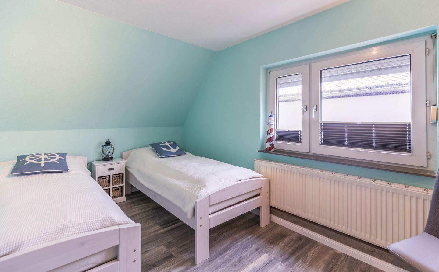 2 Einzelbetten à 0,90m x 2,00m, Lattenrost Kopfteil verstellbar, Nachttisch + Lampe, Kommoden, Flachbild-TV, Verdunkelungsplissee, Fliegengitter