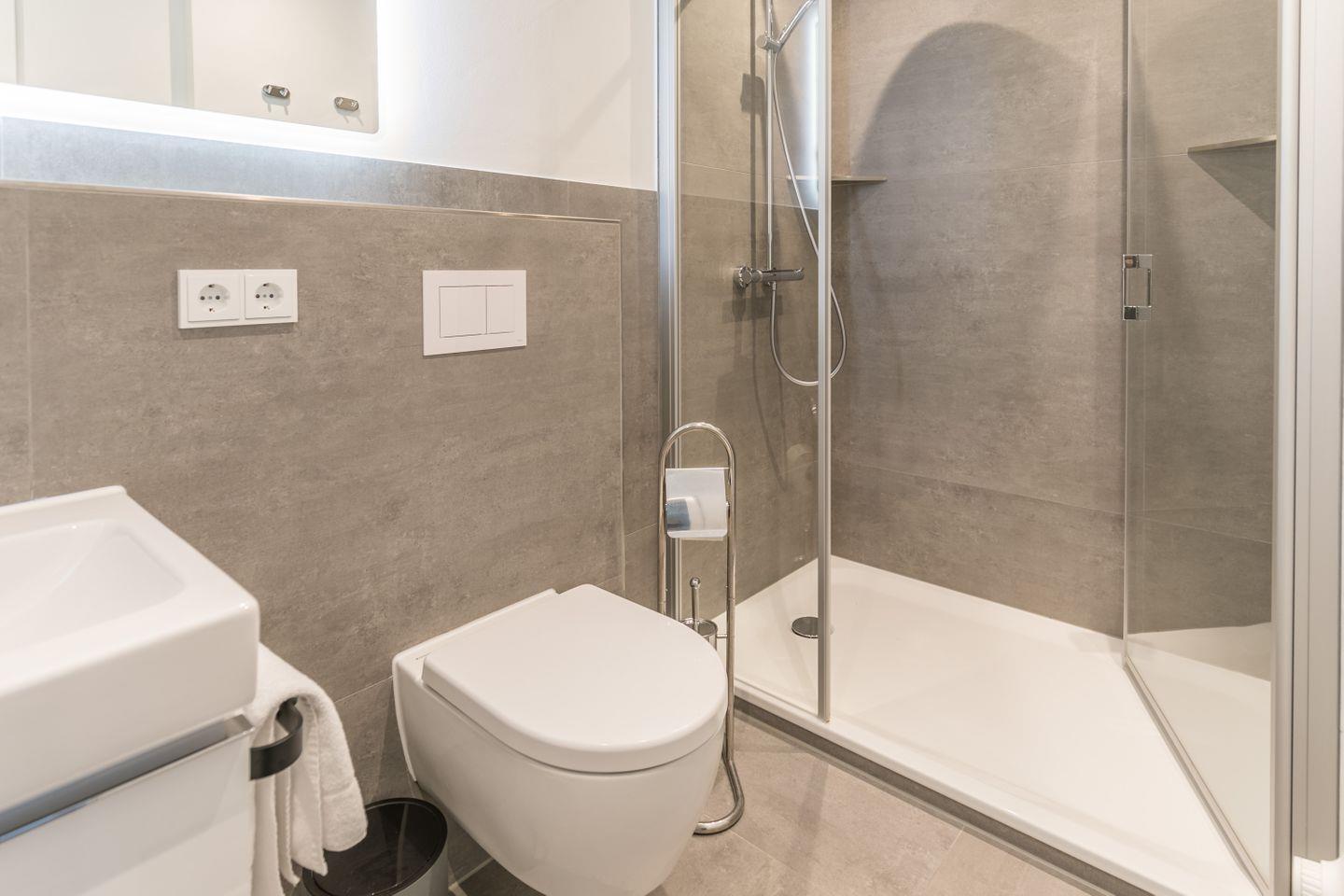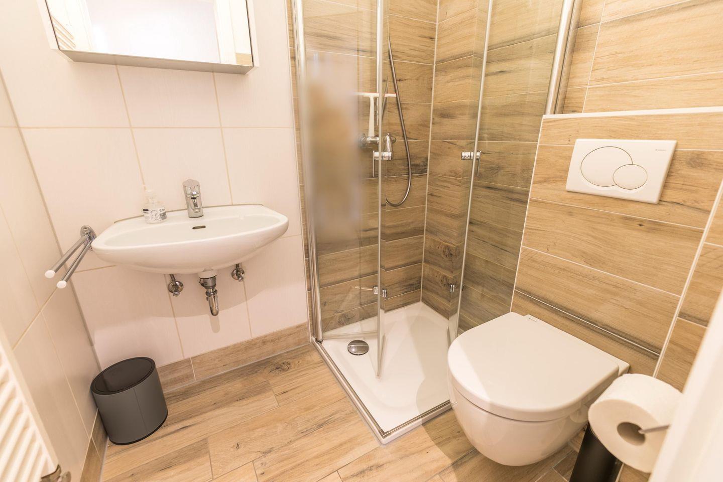 Dusche, WC, Waschbecken, Spiegel mit Ablage, Handtuchtrockner, Föhn, Fußbodenheizung, Abluft