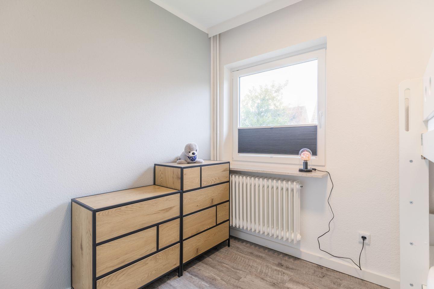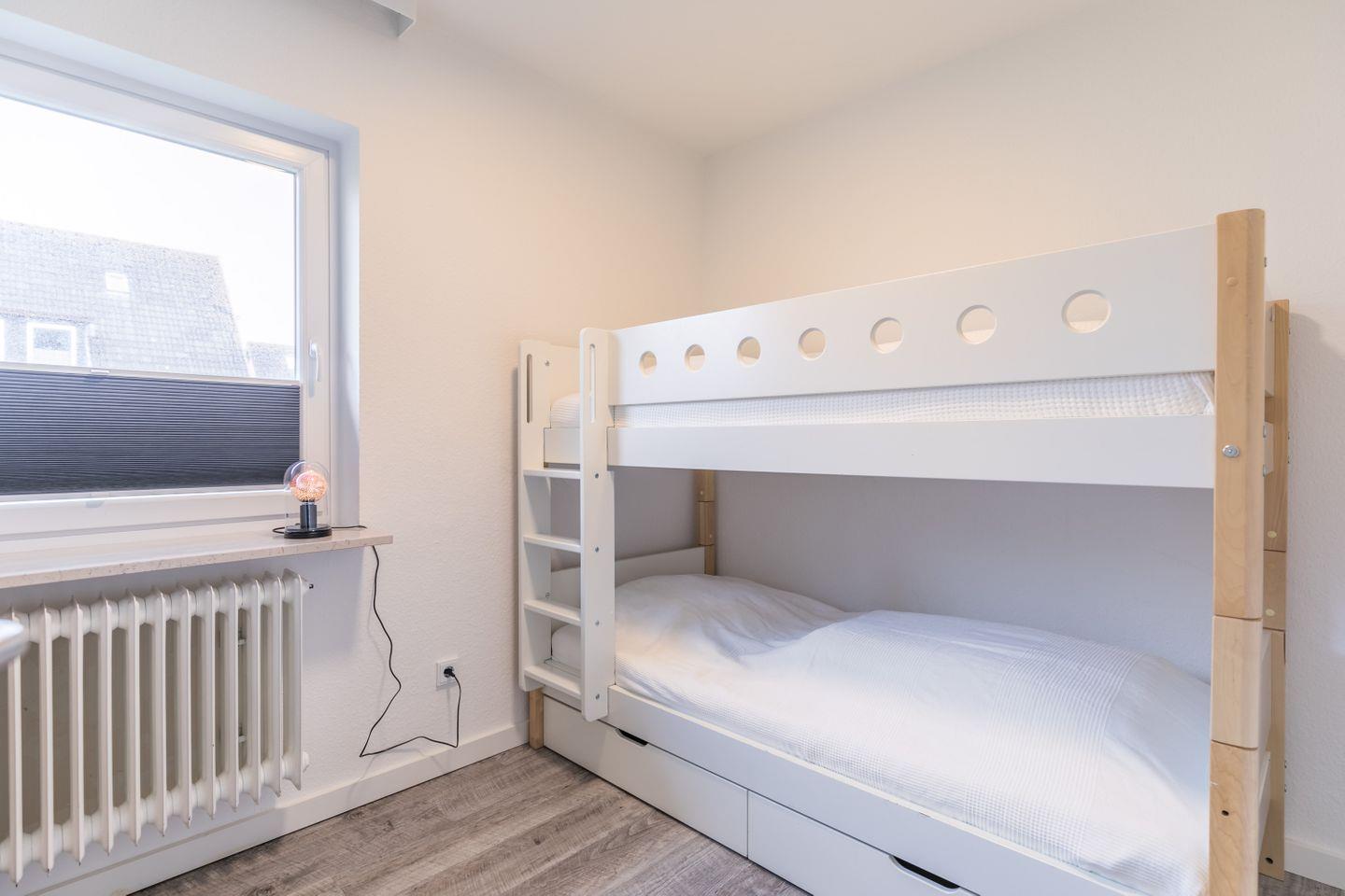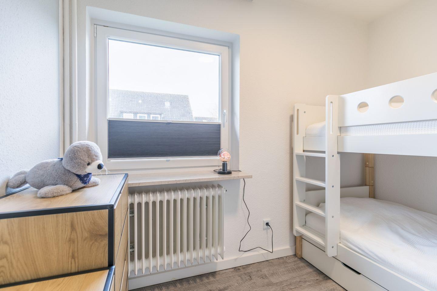 Etagenbett, Bettlampen, 2 Kommoden, Verdunkelungsplissee