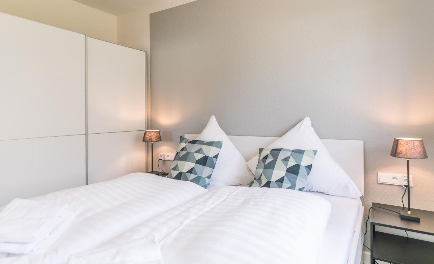 Doppelbett (1,80x2,00m) mit Nachttischen und Lampen, Lattenrost Kopf- und Fußteil höhenverstellbar, Kleiderschrank, Flachbild-TV, Verdunkelungsplissee