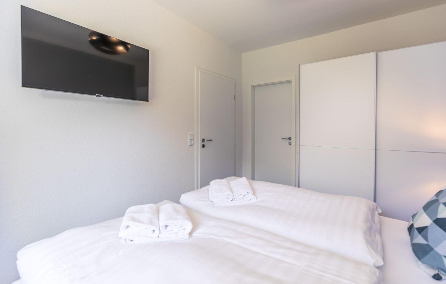 Doppelbett (1,80x2,00m) mit Nachttischen und Lampen, Lattenrost Kopf- und Fußteil höhenverstellbar, Kleiderschrank, Flachbild-TV, Verdunkelungsplissee, Schranktresor