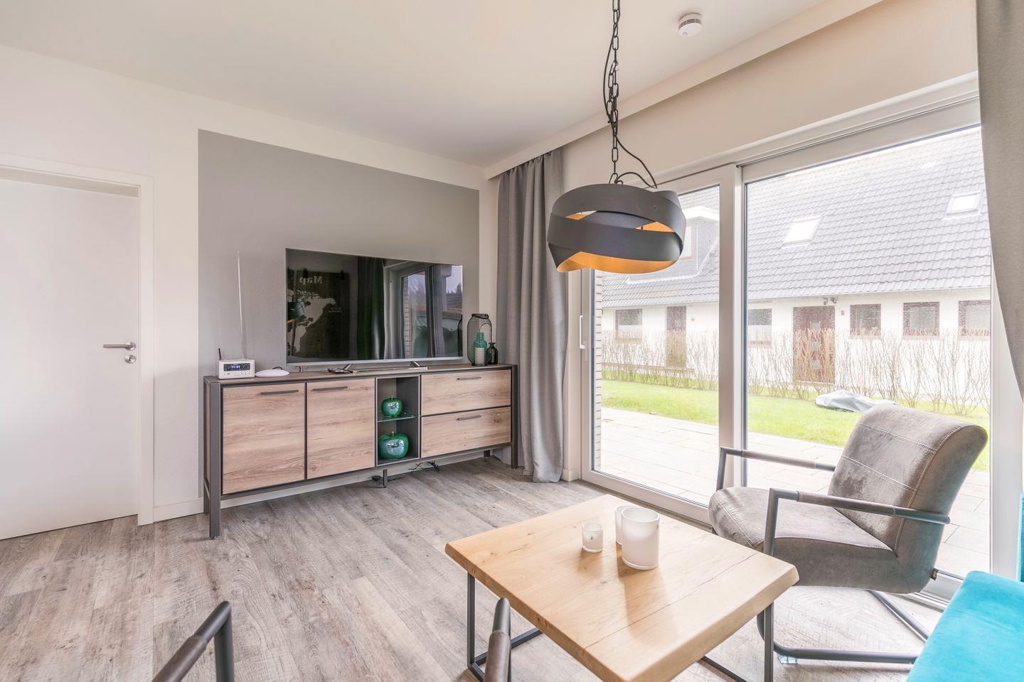 Couch, 2 Sessel, Couchtisch, 58“-Flachbild-Smart-TV, TV-Sideboard inkl. Beleuchtung, Radio mit Bluetooth und Wifi-Verbindung, Zugang zur eigenen Süd-Terrasse mit Gartenmöbeln und Strandkorb