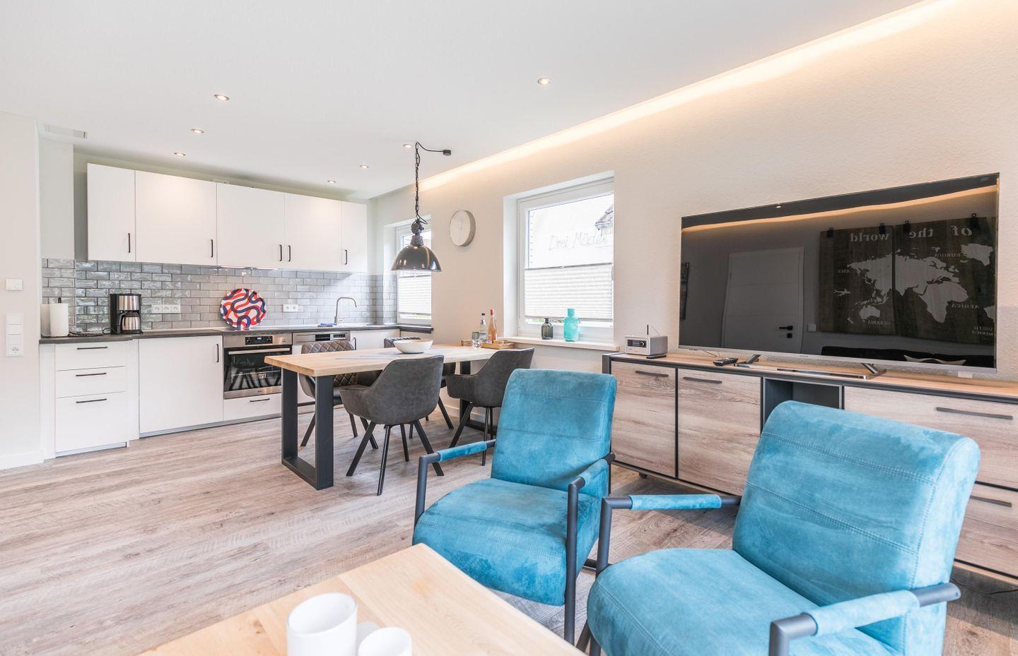 Die Wohnung 2 befindet sich im Erdgeschoss und hat einen eigene Süd-Terrasse samt Gartenmöbeln sowie hochwertigem, großen Strandkorb. Exklusiv für die Gäste der Lodge 2 steht Ihnen eine eigene Sauna für 2 Personen zur Verfügung. Ein Parkplatz ist ebenso wie ein Fahrradraum auf dem Grundstück vorhanden. Eine gehobene Ausstattung, u.a. mit drei Fernsehern, macht Ihren Urlaub komfortabel! In der offenen Küchenzeile sind alle wichtigen Küchengeräte vorhanden!